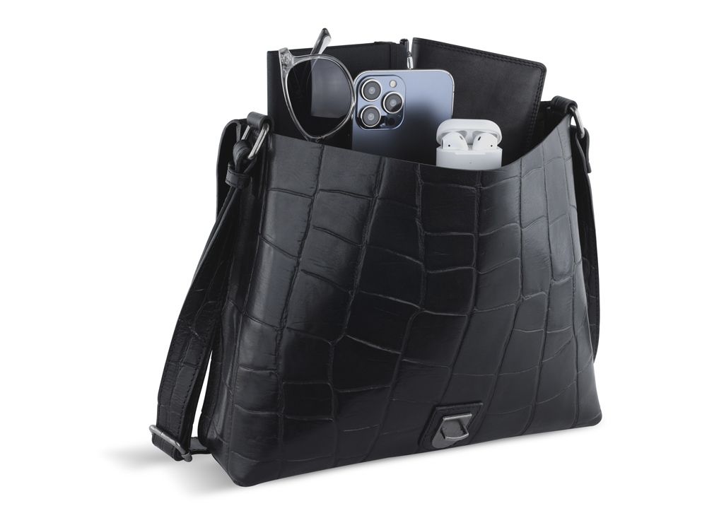 В этой изысканной коллекции сочетаются естественная элегантность и современный стиль. Премиальная воловья кожа с тиснением под крокодила искусно комбинируется с гладкой фактурой козьей кожи. Металлические детали придают индивидуальный характер, подчеркивая природную красоту материалов.