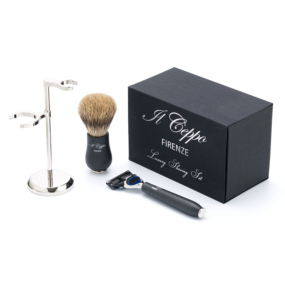 Бритвенный набор IL Ceppo: станок, помазок, подставка, качуковая смола/никелированная латунь, FUSION, натуральный ворс барсука BEST BADGER, SET-S10316FT