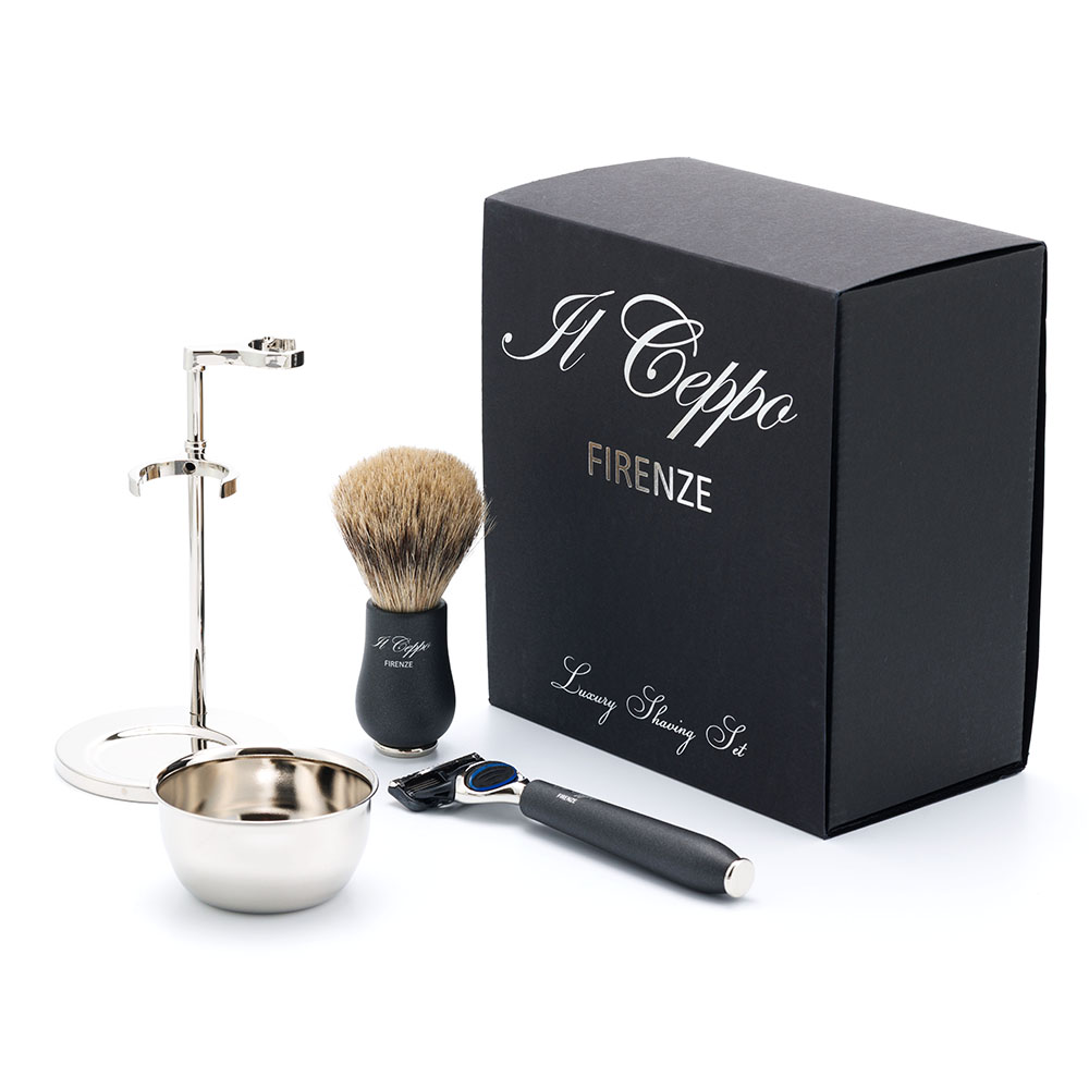 Бритвенный набор IL Ceppo: станок, помазок, подставка, чаша, качуковая смола/никелированная латунь, FUSION, натуральный ворс барсука BEST BADGER, SET-S10416FT
