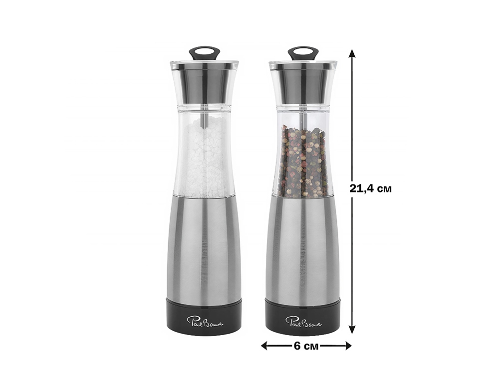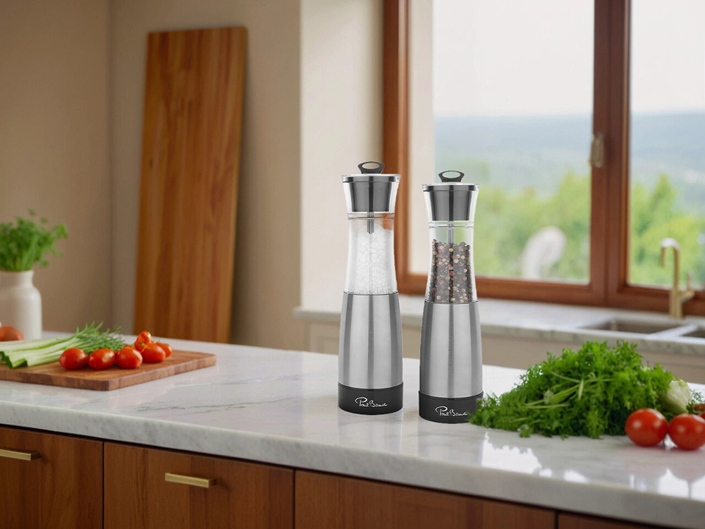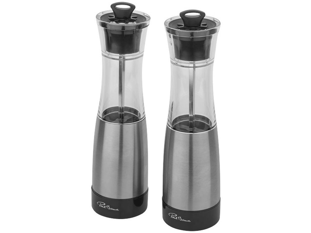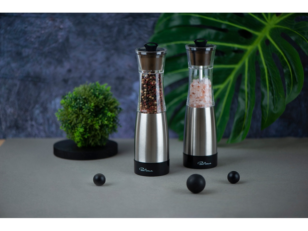 В комплект входят две мельницы, оснащенные высококачественным керамическим механизмом, который обеспечивает равномерное и эффективное измельчение специй. Приводятся в действие вручную, что позволяет легко контролировать степень помола. Изготовлены из прочной нержавеющей стали с элементами прозрачного акрила, что придаёт набору современный и элегантный вид.