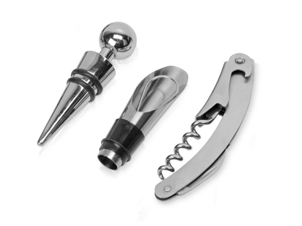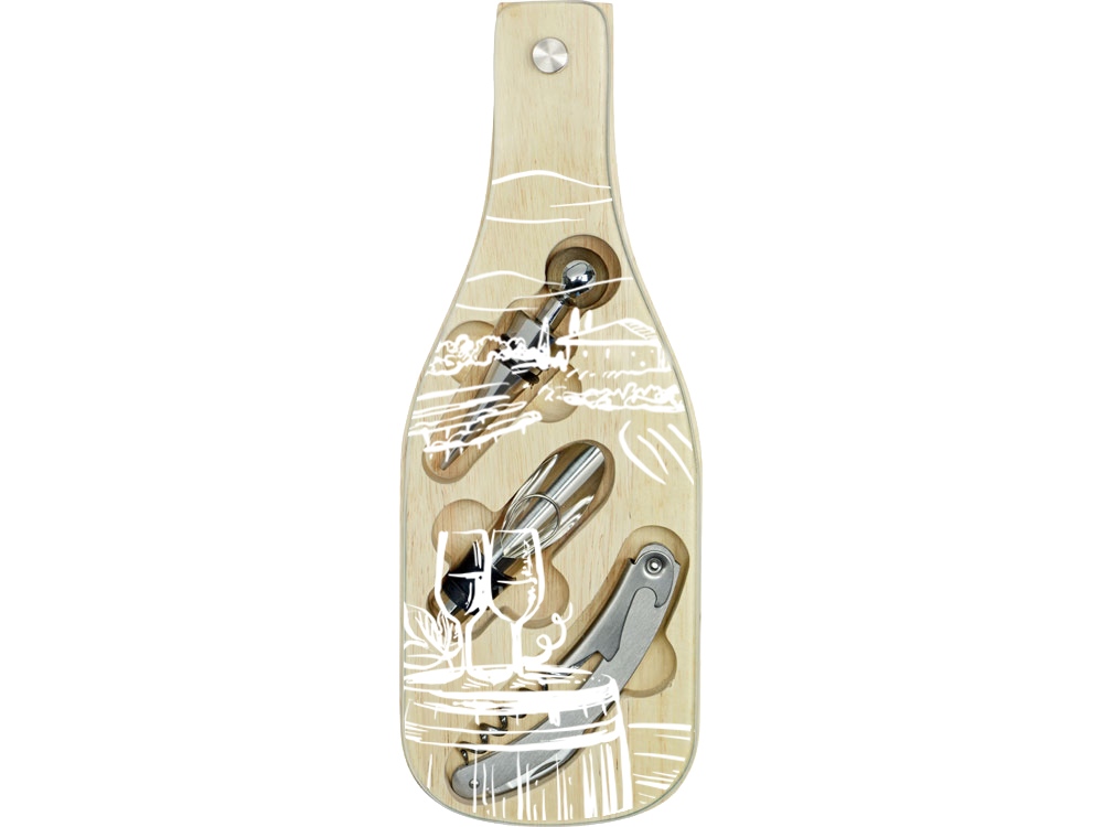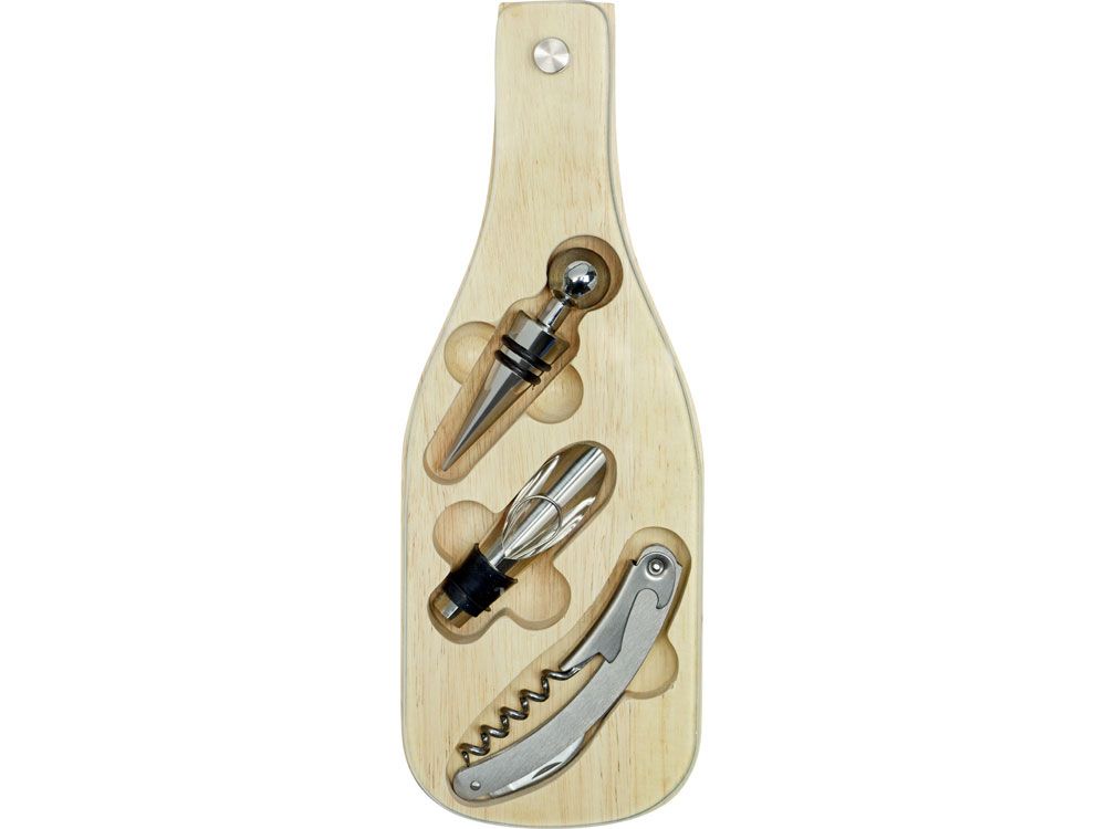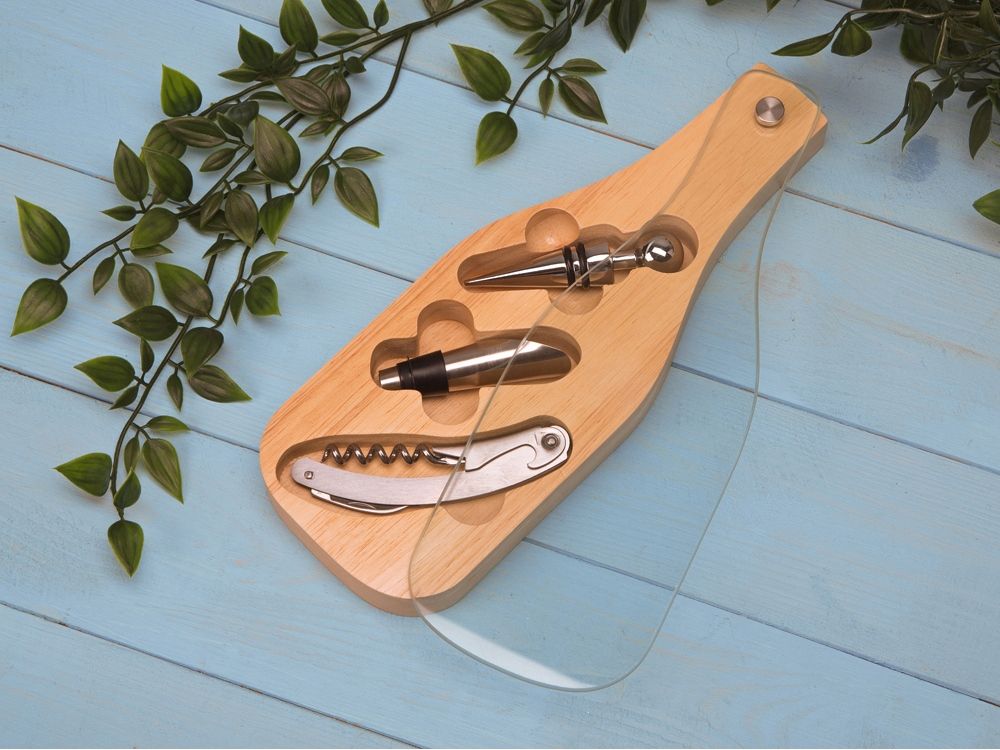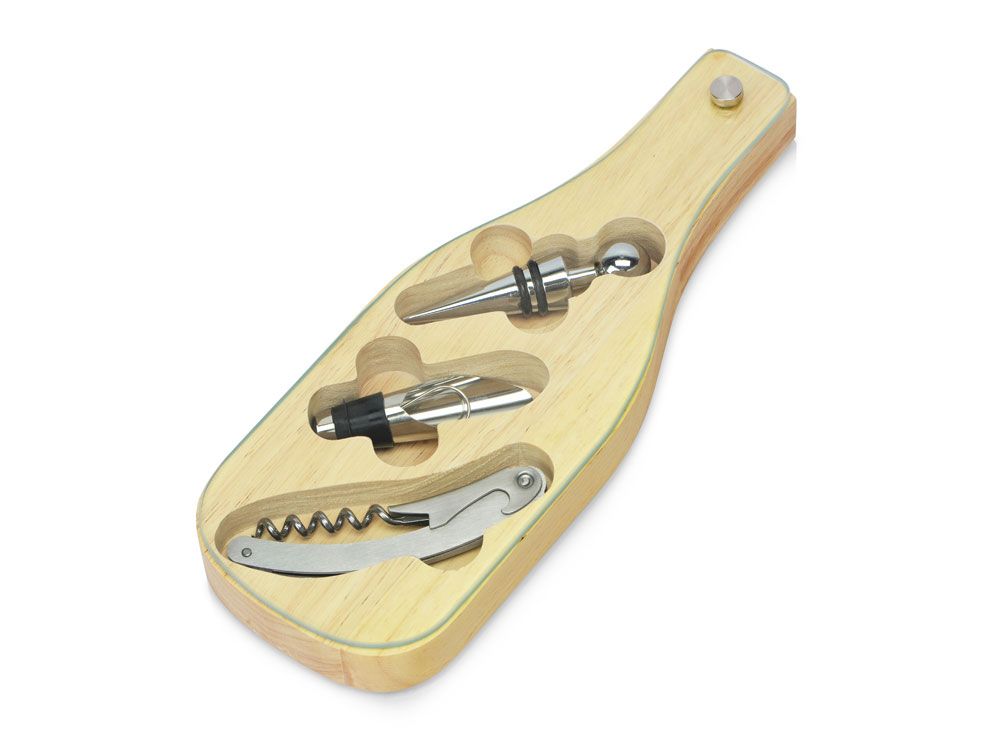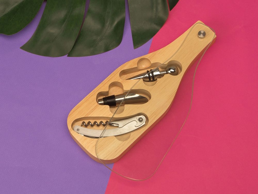 Деревянная часть футляра имеет три вырезанные ниши под каждое из приспособлений для вина, дополненные выемками под пальцы для удобного извлечения.