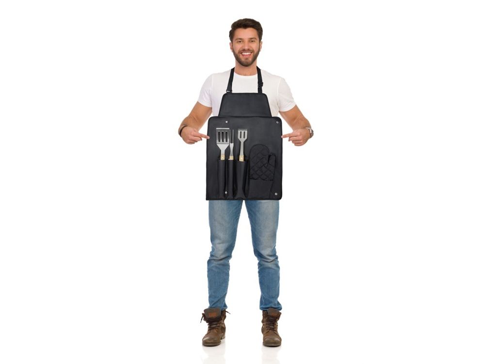 лопатка 36,5 x 7 см, вилка 36,5 x 2 см, щипцы 36,5 x 5 см, перчатка 25 x 16 см, фартук с сумкой 42 x 60 см |