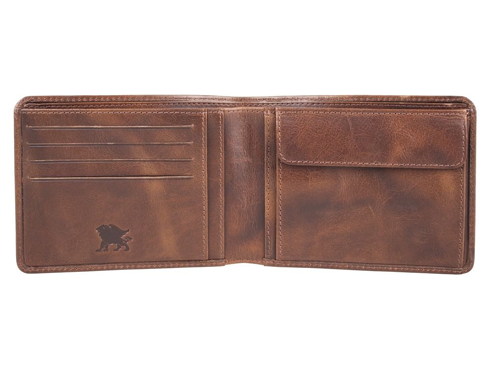 Бумажник изготовлен вручную из натуральной воловьей кожи, обеспечивает удобное и функциональное хранение купюр, кредитных карт и монет.