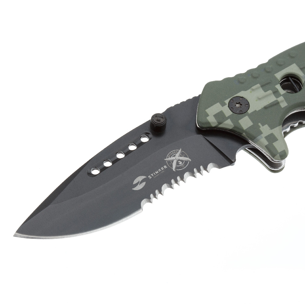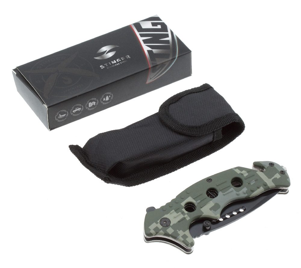 Нож складной Stinger, 95 мм, (чёрный), материал рукояти: алюминий (зелёный камуфляж), FK-008X