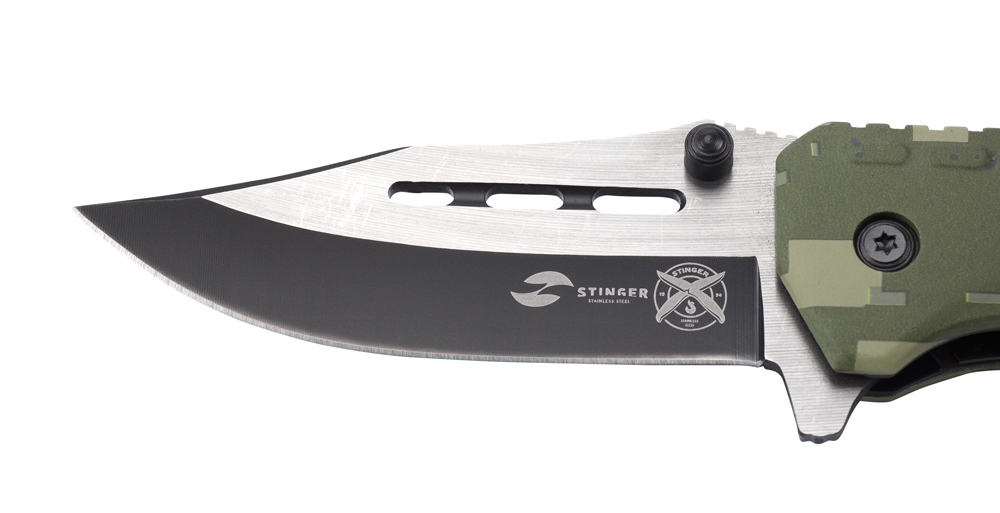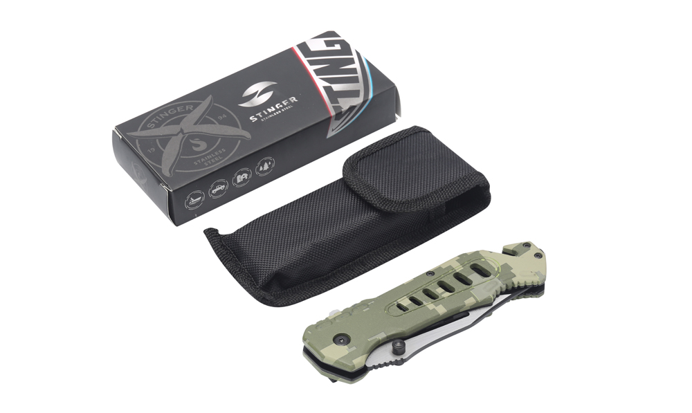 Нож складной Stinger, 88 мм (серебристый), материал рукояти: алюминий (зелёный камуфляж), FK-008H