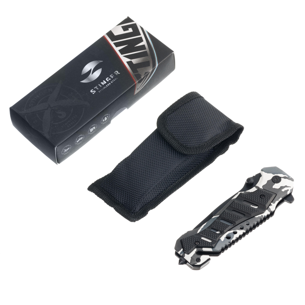 Нож складной Stinger, 90 мм, (чёрный), материал рукояти:сталь/алюминий (серый камуфляж/чёрный), SA-582DW