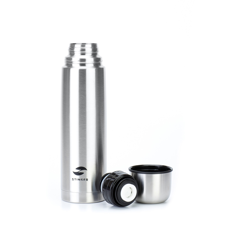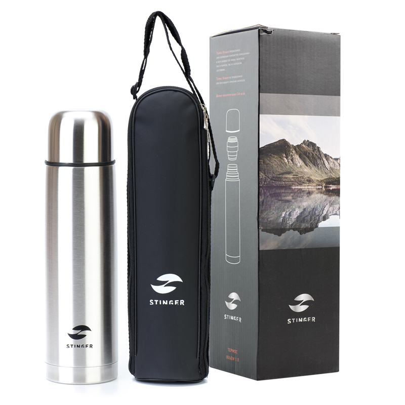 Термос Stinger с чехлом, 1 л, узкий, сталь/кожзаменитель, с чехлом, серебристый, 8,6 х 8,6 х 31,4 см, HB-1000A