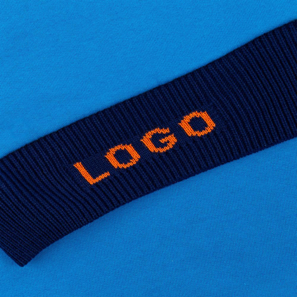 Вязаная резинка с вывязанным логотипом или просто в фирменной цветовой гамме.