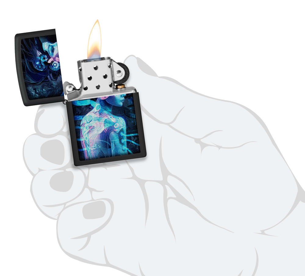 Зажигалка ZIPPO Cyborg Woman с покрытием Black Light, латунь/сталь, черная, матовая 38x13x57 мм, 48517