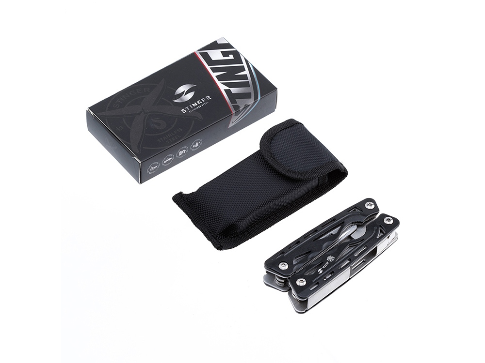 Мультитул Stinger, 104x43 мм, 13 функций, сталь/алюминий, чёрно-серебристый, в нейлоновом чехле, 441119