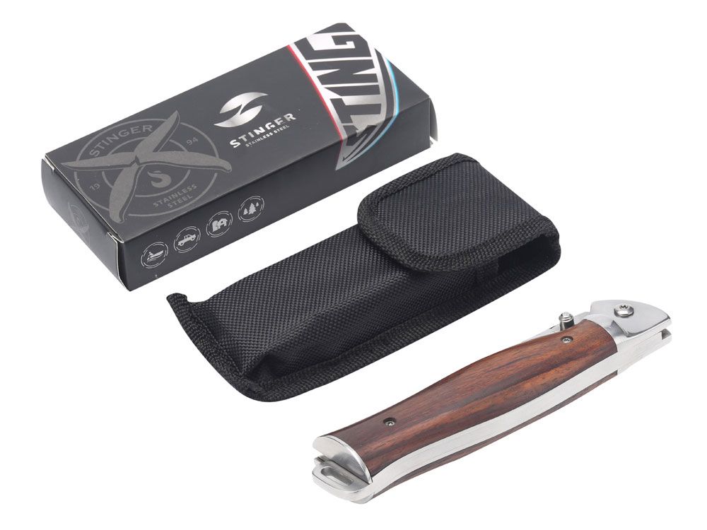 Нож складной Stinger, 106 мм, (серебристый), материал рукояти: сталь/дерево (серебристо-коричневый), 441148
