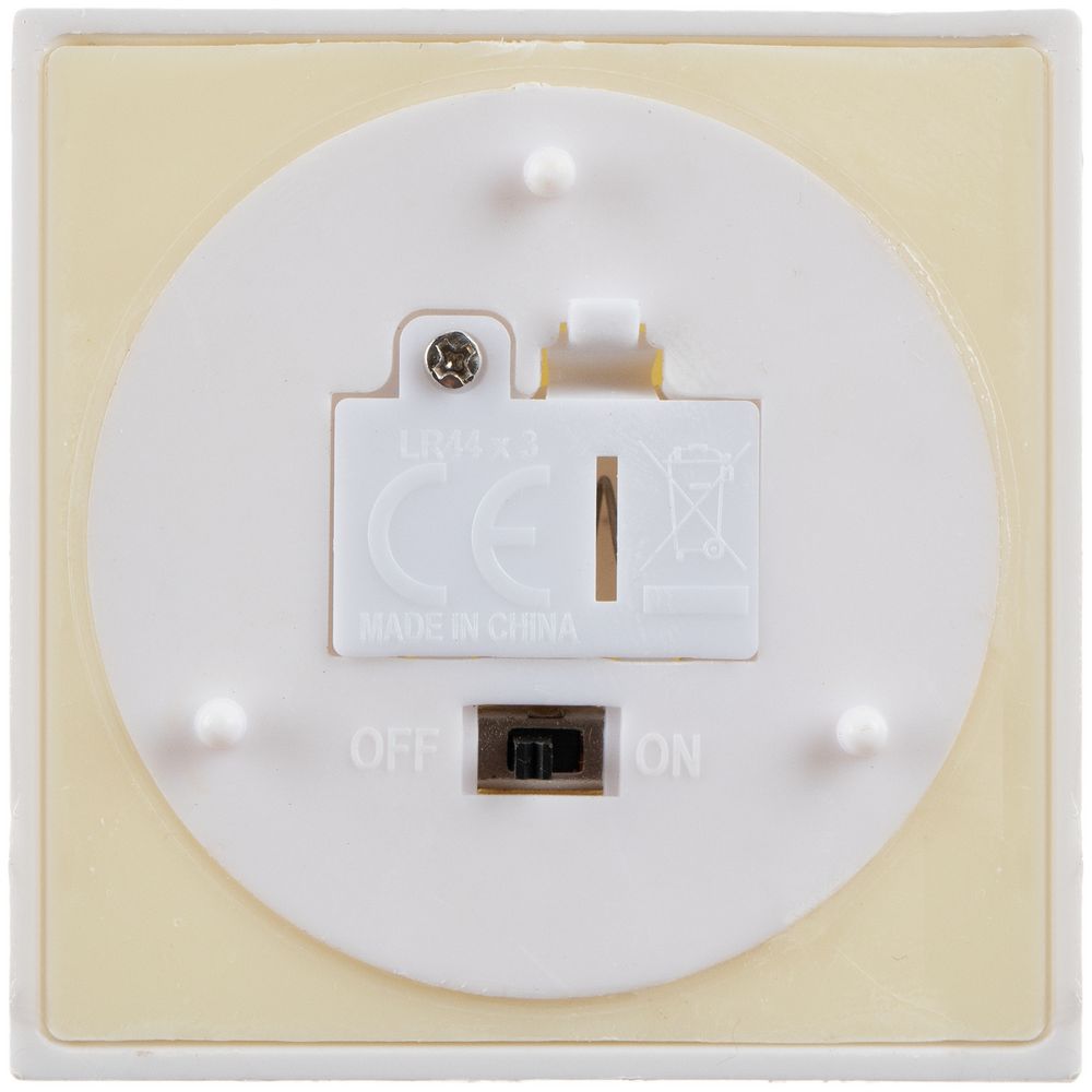 Внутри LED-свеча с теплым светом. Работает от 3 батареек типа LR44 (в комплект не входят).