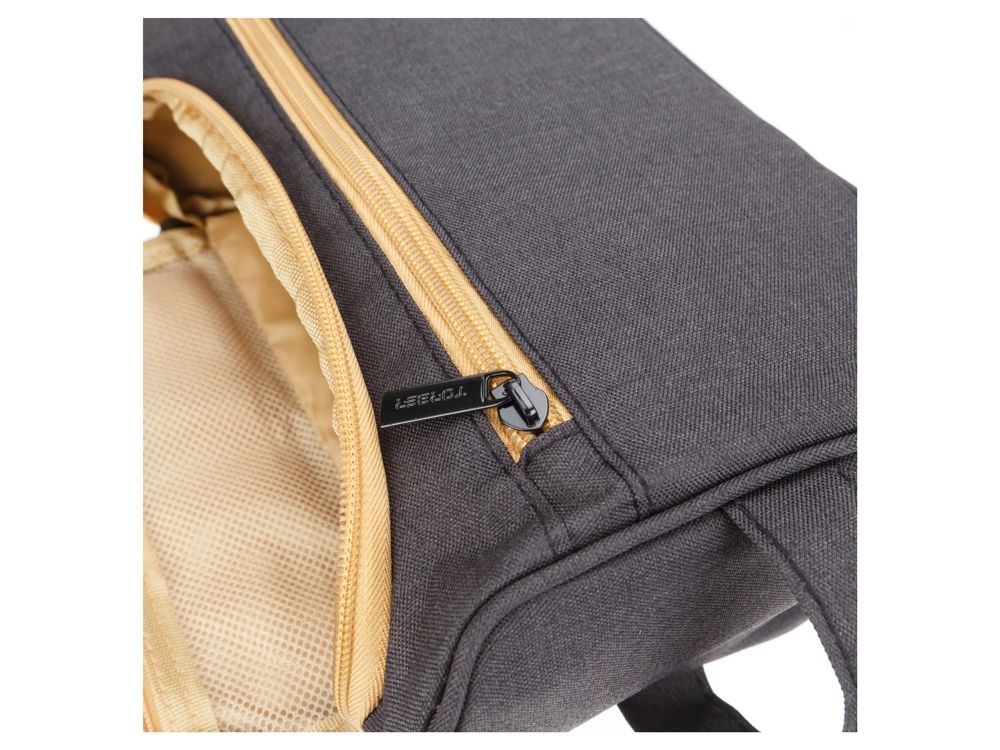 Молния основного отделения расположена в верхней части сумки, что увеличивает объем полезного пространства и позволяет разместить максимальное количество вещей. Имеется крючок для подвешивания. С внешней стороны расположен передний карман на молнии. Для переноски есть удобная боковая ручка.