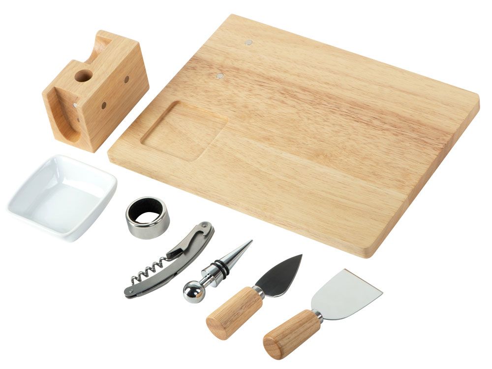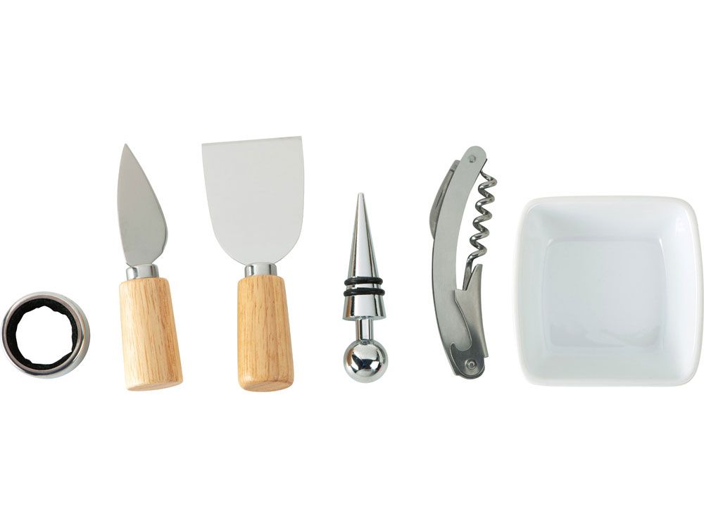 разделочная доска / доска для подачи закусок, соусница / емкость для оливок , штопор, пробка для вина, кольцо для винной бутылки, два сырных ножа |