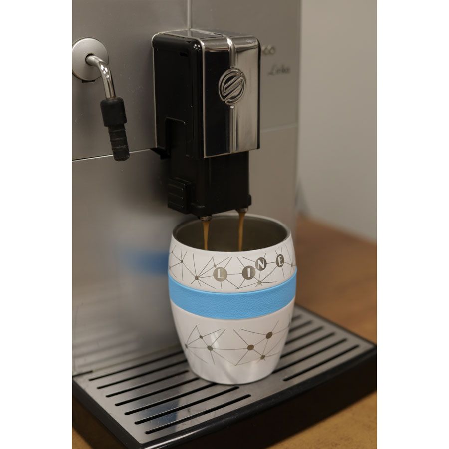 Высота без крышки 9,7 см, подходит для большинства кофемашин.