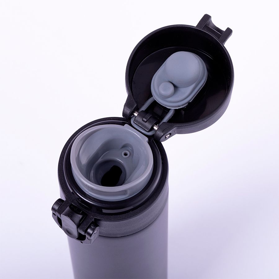 Двойная стенка для лучшего и длительного сохранения температуры напитков, простой механизм открывания с помощью кнопки.