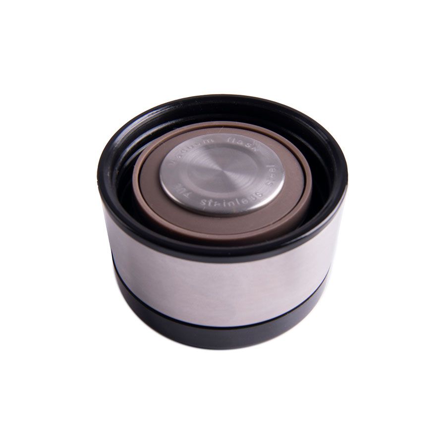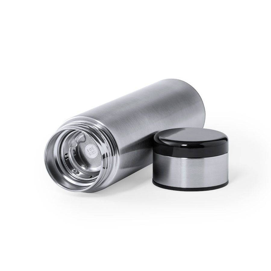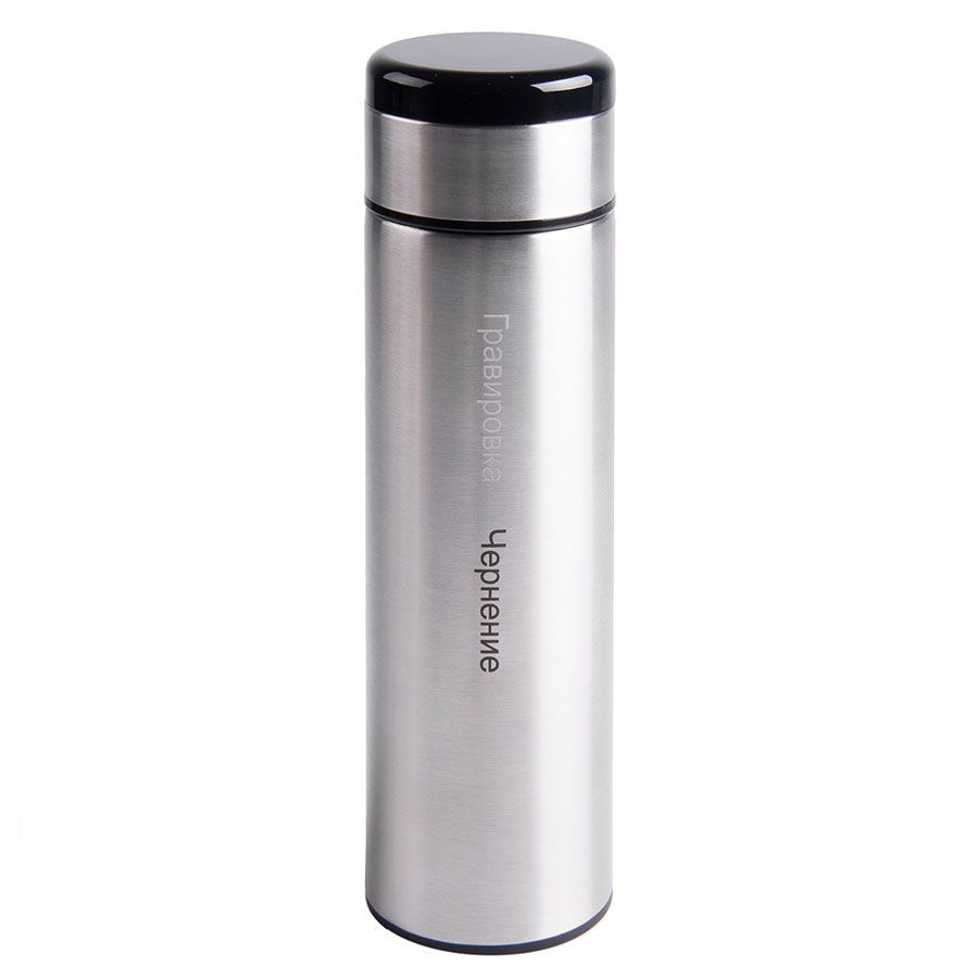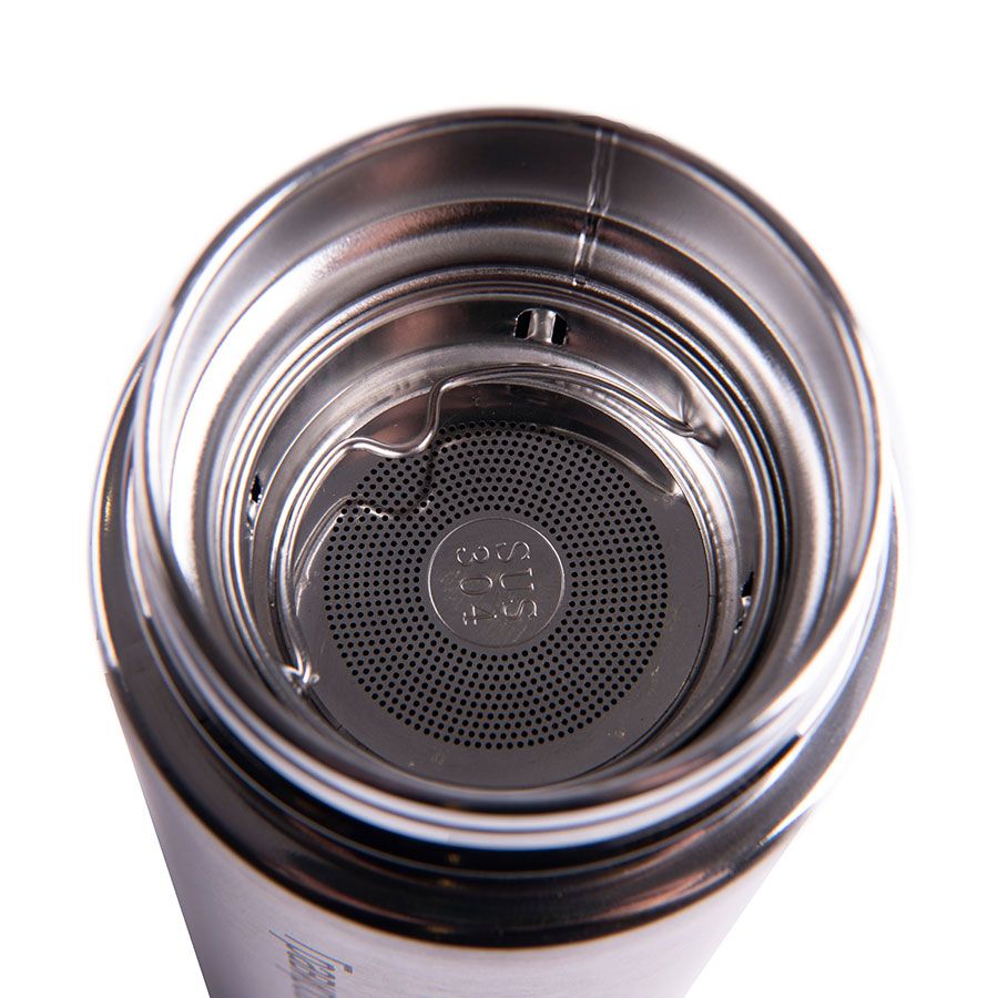 Термос имеет навинчивающуюся крышку и ситечко.