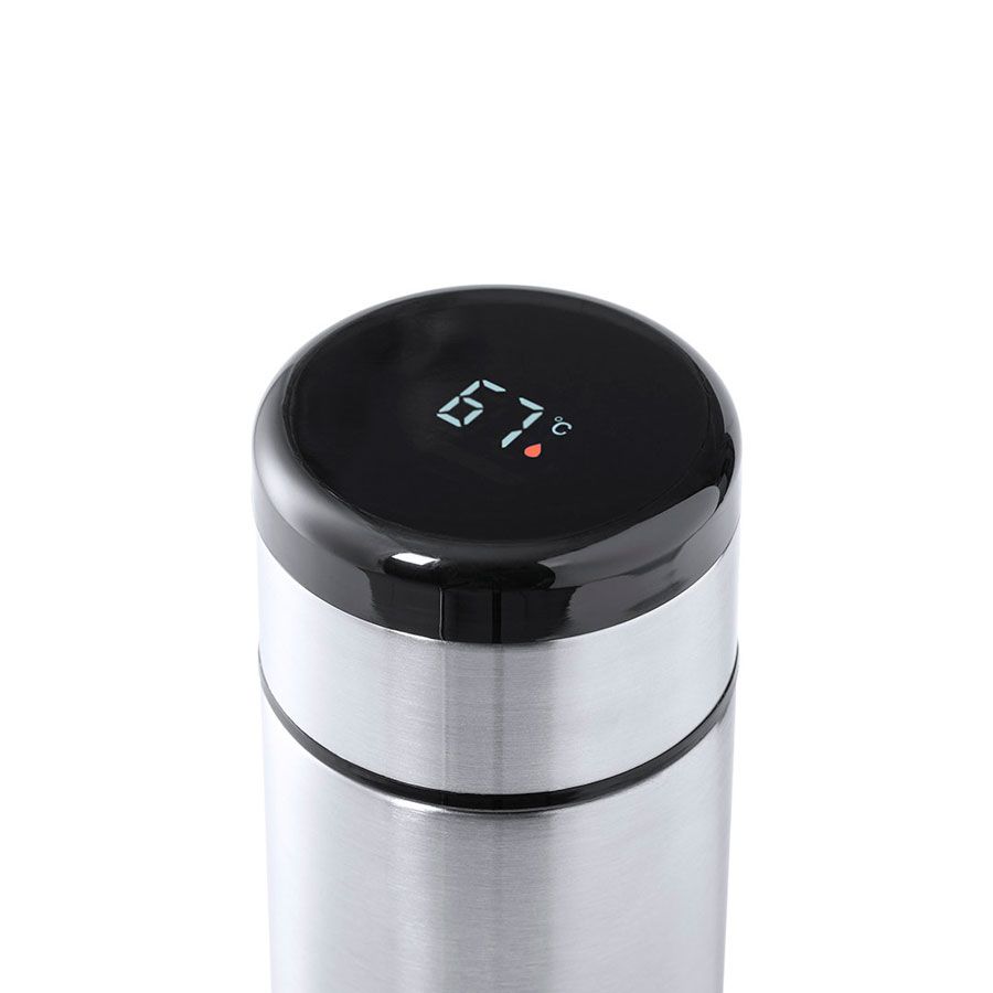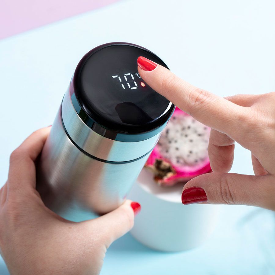 Термос из нержавеющей стали емкостью 420 мл с датчиком температуры и сенсорным экраном, встроенным в крышку.