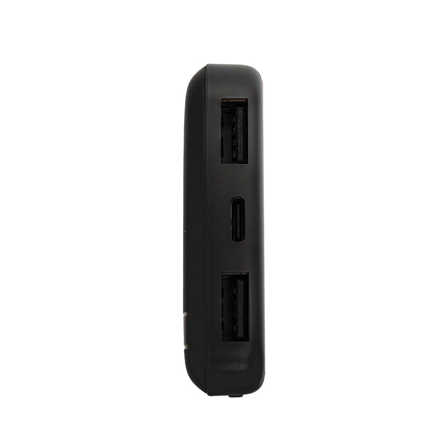 Внешний аккумулятор имеет пластиковый матовый корпус. Пауэрбанк заряжается через универсальный порт Type-C и отдает энергию через два классических порта USB. Благодаря встроенному в корпус индикатору уровня заряда батареи, удобно следить за расходом батареи.