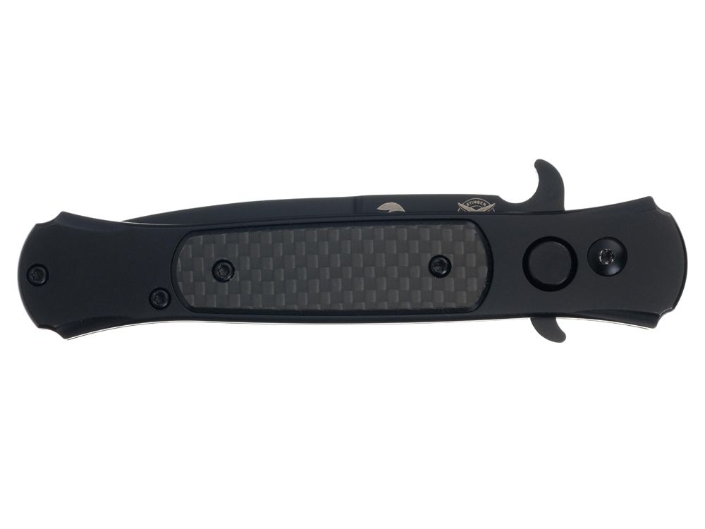 Рукоять ножа изготовлена из нержавеющей стали с накладками из карбона (углепластика) – это полимерный материал с композитным составом, изготовленный из переплетенных нитей углеродного волокна с использованием эпоксидных смол. Карбон является легким и исключительно прочным материалом, стойким к высоким температурам и агрессивным средам, отлично переносит влагу. Рукоять ножа собрана на втулках - бонках, поэтому при необходимости его можно легко промыть. На рукояти расположена съемная клипса для удобного размещения ножа в кармане. Нож мгновенно открывается и надежно фиксируется благодаря замку Button Lock. Дополнительные упоры на клинке могут выполнять функцию гарды, предотвращая соскальзывание руки на лезвие клинка.