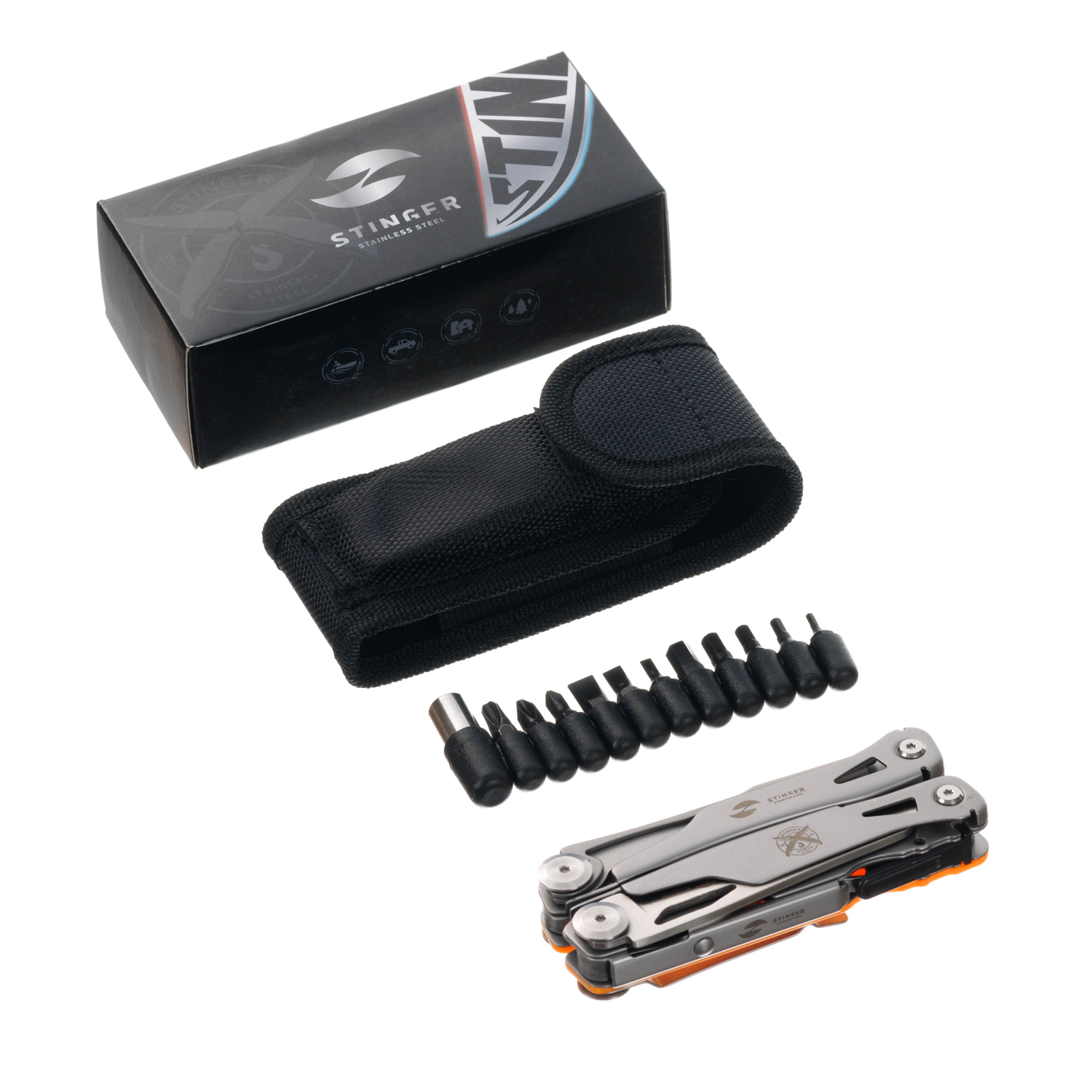 Мультитул Stinger, 106 мм, 15 функций, сталь/АБС-пластик, оранжевый, в комплекте нейлоновый чехол, MT-GHK8P
