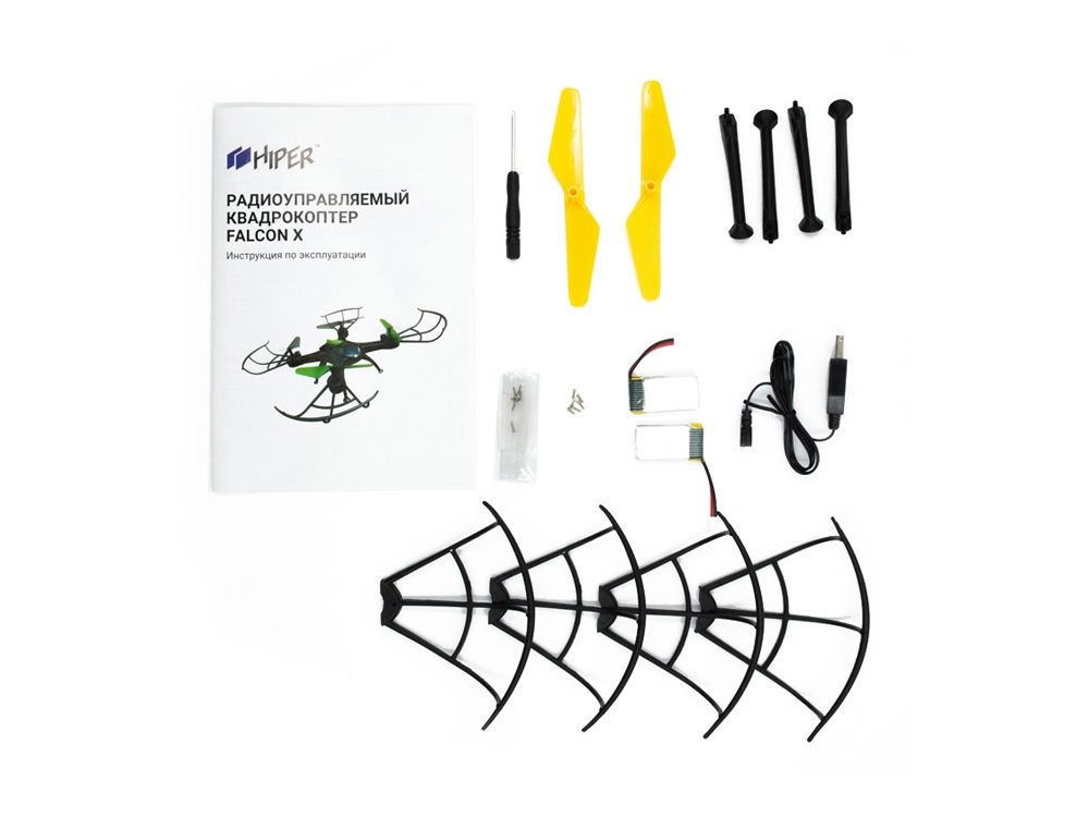 квадрокоптер, ПУ, аккумулятор- 2шт, USB кабель, запасные лопасти, запасные винты, стойка шасси- 4шт, защита пропеллеров, отвертка, инструкция |