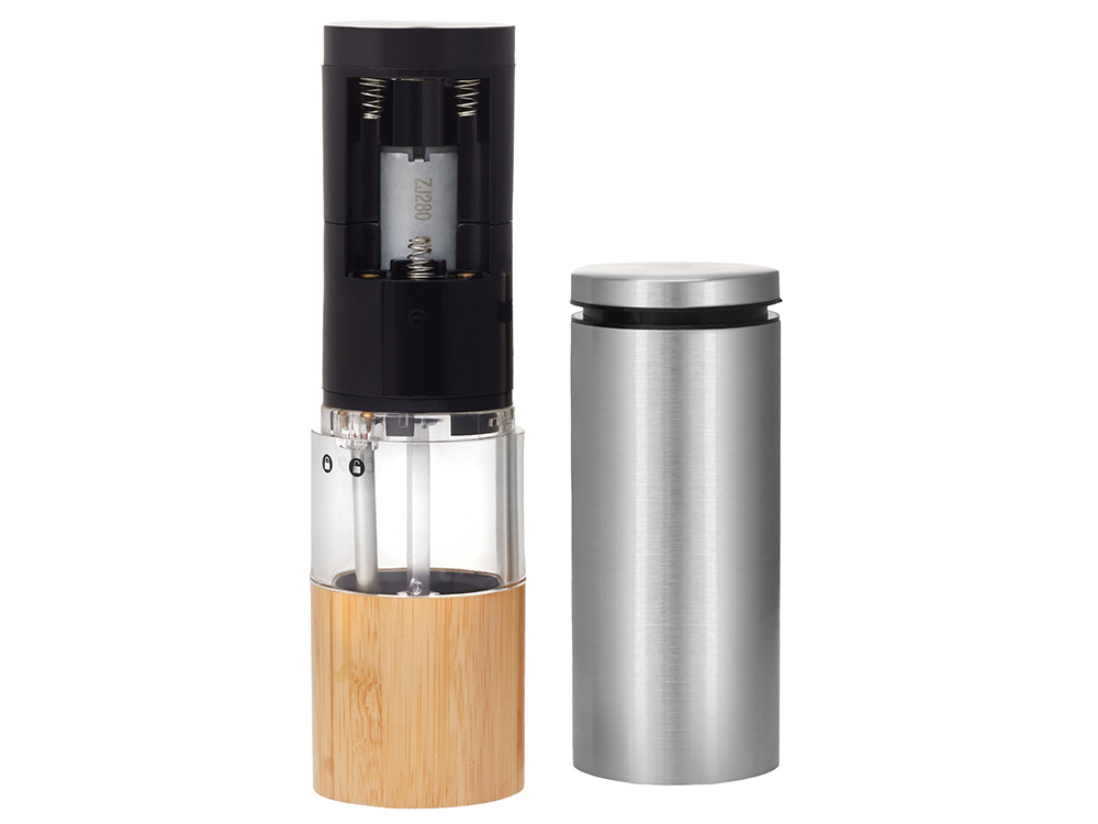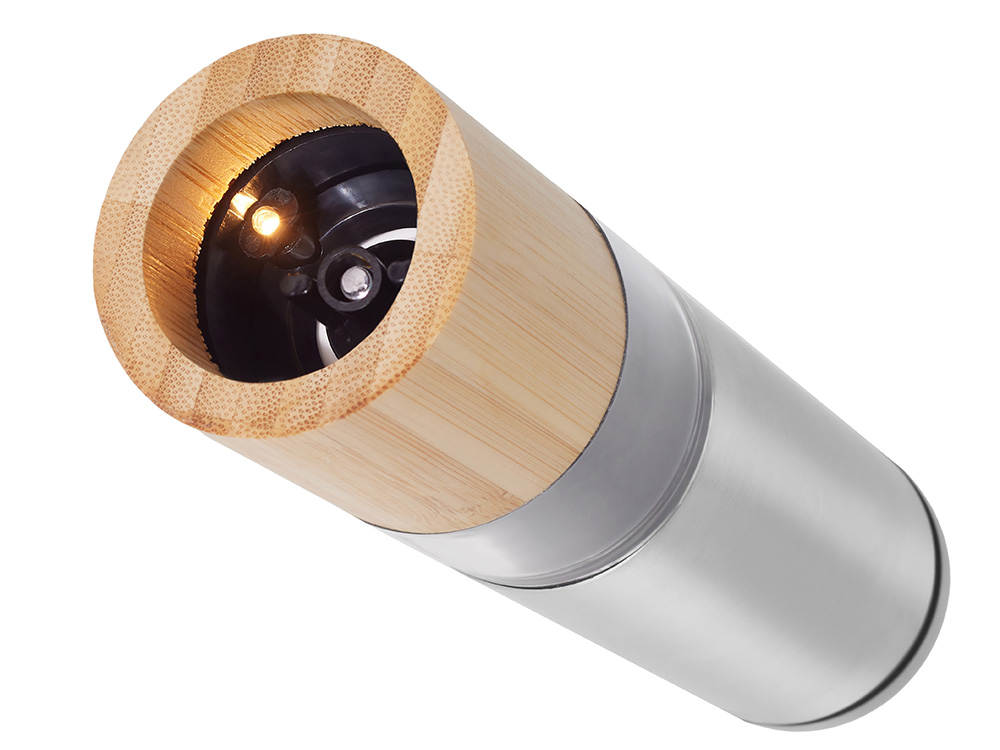 Элегантный и практичный корпоративный подарок, который добавит вкуса в любую кухню — электрическая мельница для специй, сочетающая трендовый дизайн и современную функциональность. Работает от 6 батареек AAA и легко справляется с солью, перцем и другими специями.