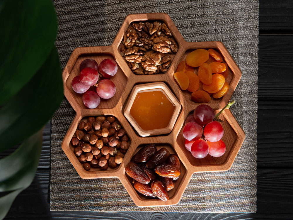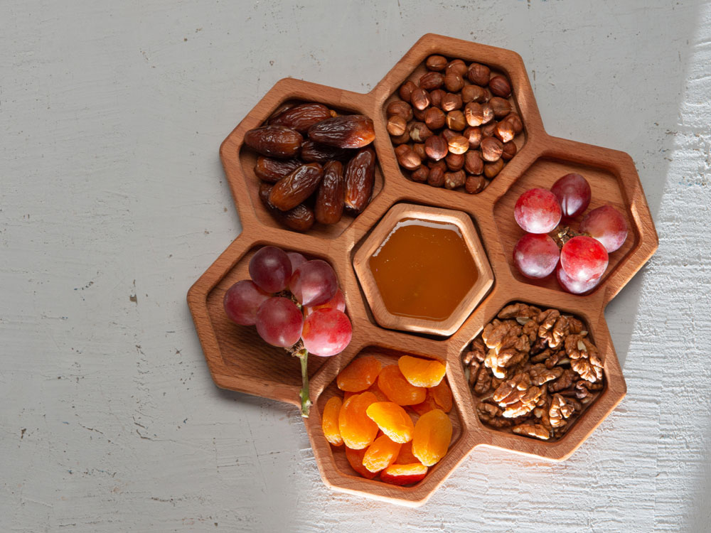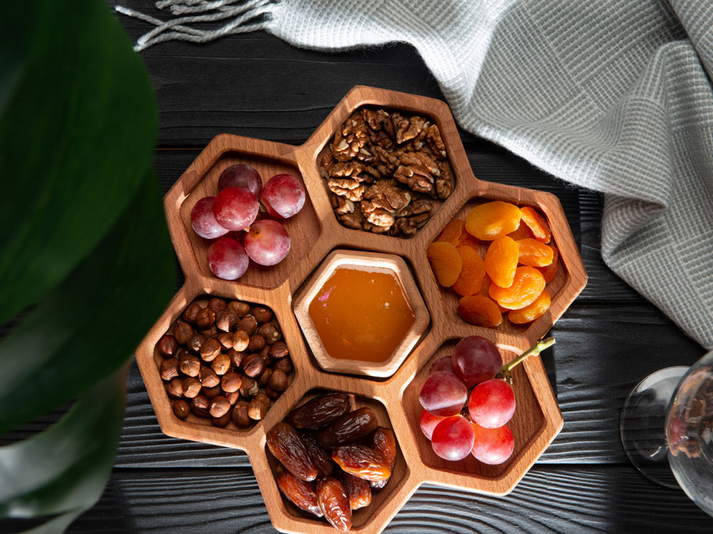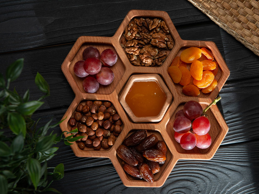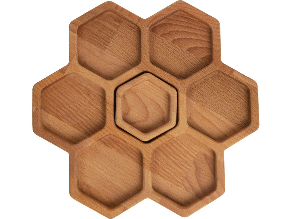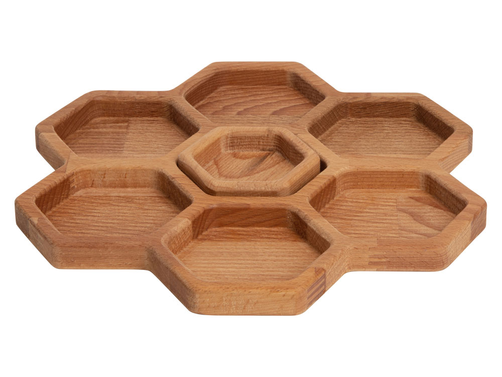 Менажница выполнена из бука и пропитана маслом, что обеспечивает изделию свежий вид. Советуем регулярно смазывать дерево пищевым маслом, чтобы изделие дольше радовало вас.