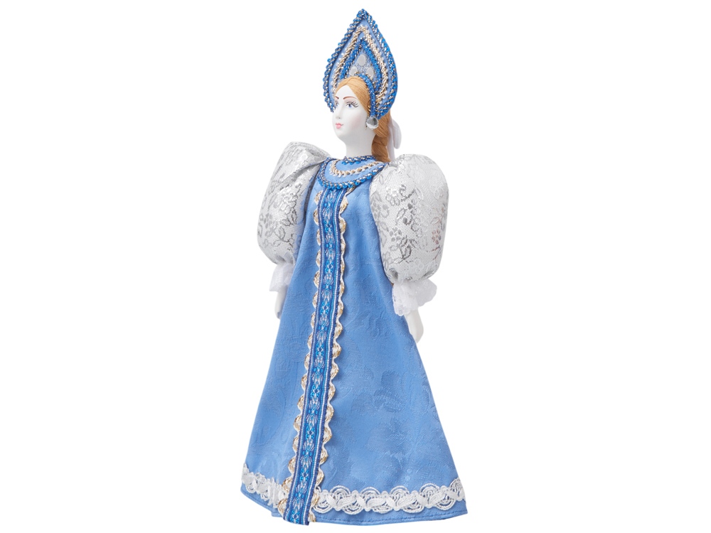 - Фарфоровая кукла в народном костюме: ручная работа, украшенная детализированным голубым сарафаном, воздушными белыми рукавами и нарядным кокошником с узорами. Кукла воплощает эстетику старинных русских праздников.