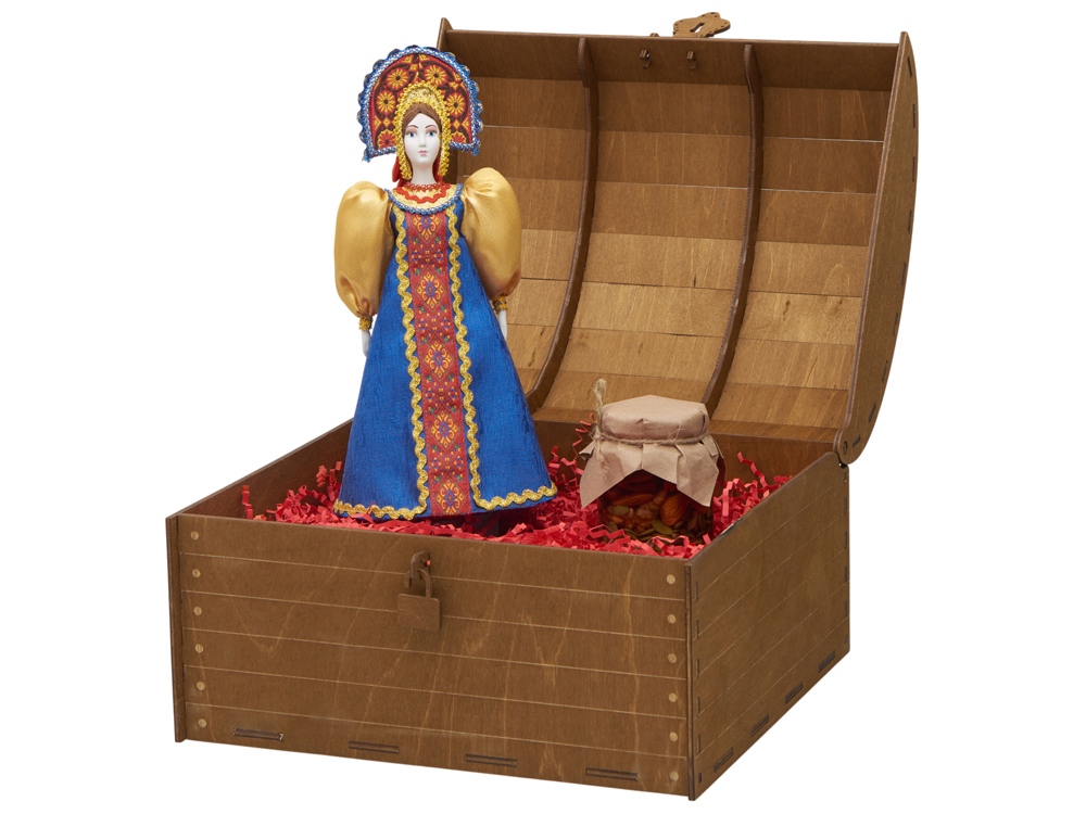 кукла- фарфор/текстиль, сундук- дерево |