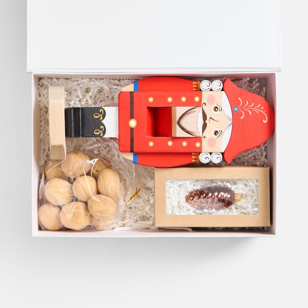 В комплекте: подарочная коробка, наполнитель, орехокол, елочная игрушка и орехи