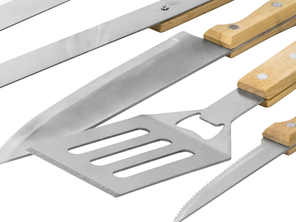 Благодаря длинным ручкам из каучукового дерева лопатку, ножи и щипцы удобно держать, не боясь горячих брызг при готовке. Деревянные ручки не нагреваются, что особенно ценно во время BBQ.