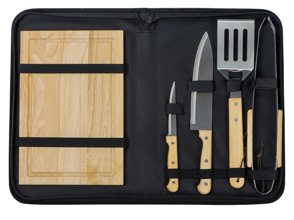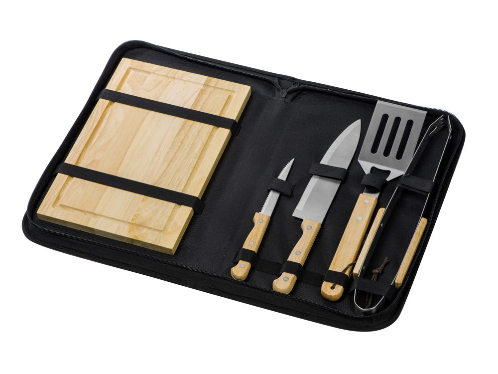 разделочная доска 20 х 30 см, щипцы 34,5 см, лопатка 32,5 см, нож для стейка 21,5 см, нож большой 31,5 см, чехол из полиэстера 38,5 х 4,5 х 24,8 см |