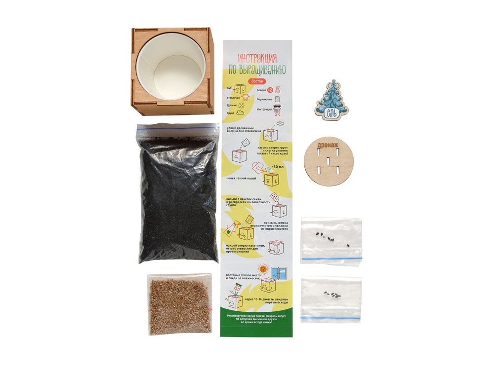 Набор включает: кубический горшок из натуральной берёзовой древесины, семена и специальный питательный грунт, подходящий для конкретного сорта.