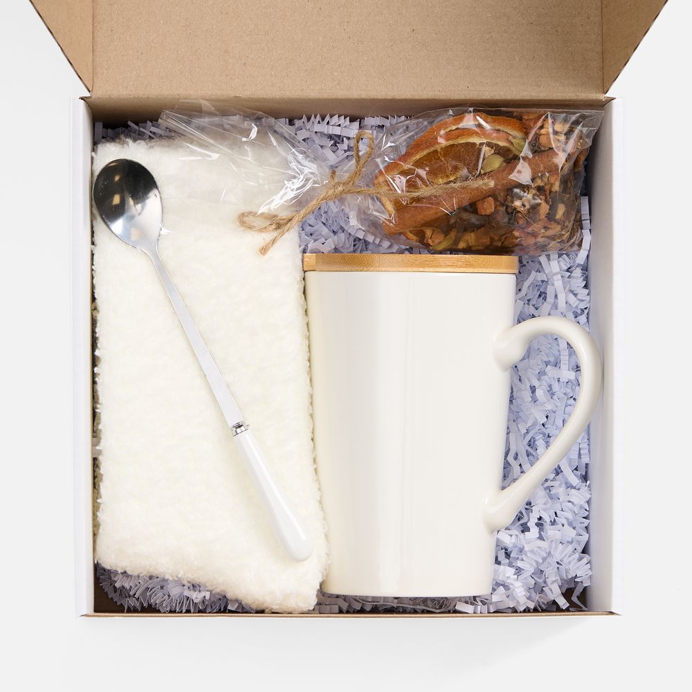 кружка - фарфор, крышка - бамбук; ложка - нержавеющая сталь; носки - полиэстер 100%; коробка - микрогофрокартон, Т-23Е |