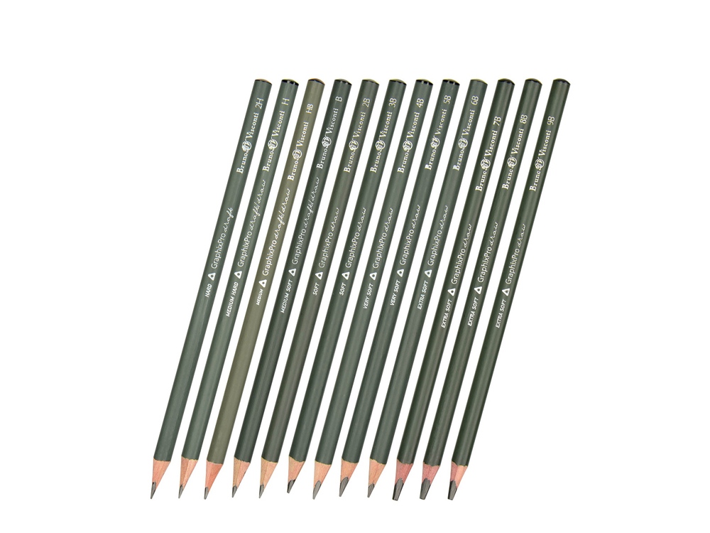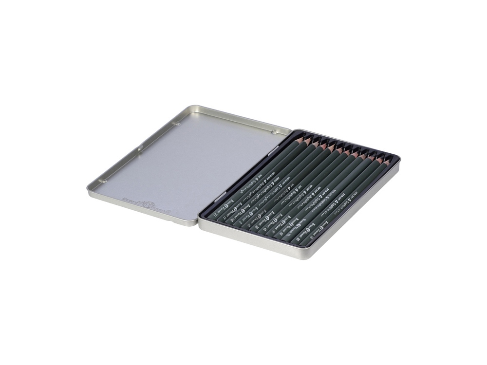 12 карандашей разной твердости (2H, H, HB, B, 2B, 3B, 4B, 5B, 6B, 7B, 8B, 9B), металлическая коробка |