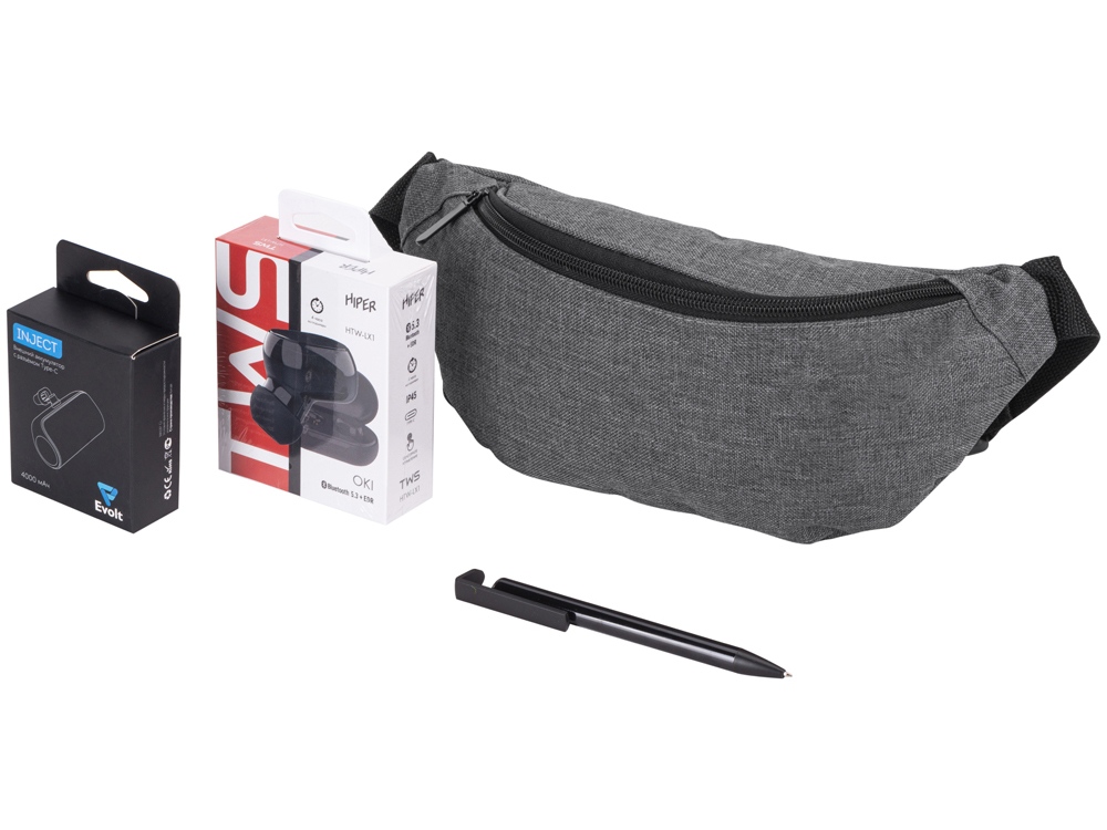 сумка на пояс, ручка шариковая, беспроводные наушники, повербанк |