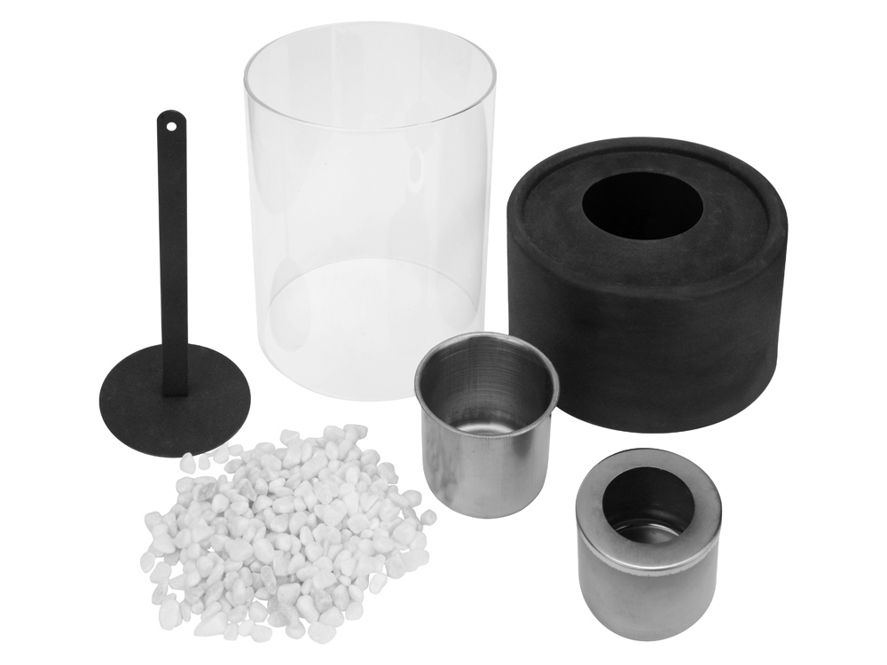 биокамин со стеклянной колбой- 1шт, емкость для топлива- 1шт, декоративные камни, заглушка для тушения пламени- 1шт, инструкция по применению |