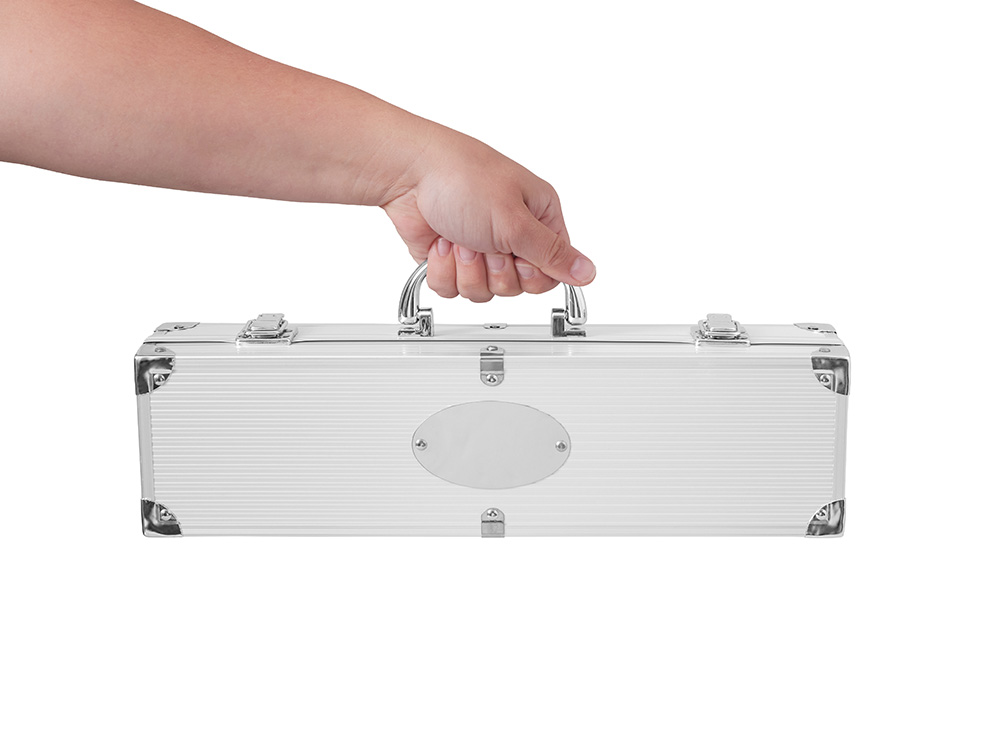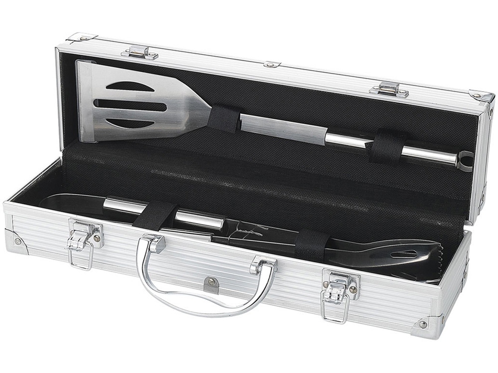 лопатка 32,4 х 8,5 х 2,9 см, щипцы 34 х 4,8 х 6,2 см, вилка 32 х 3,4 х 1,3 см, алюминиевый кейс 36,9 х 9,9 х 8 см |