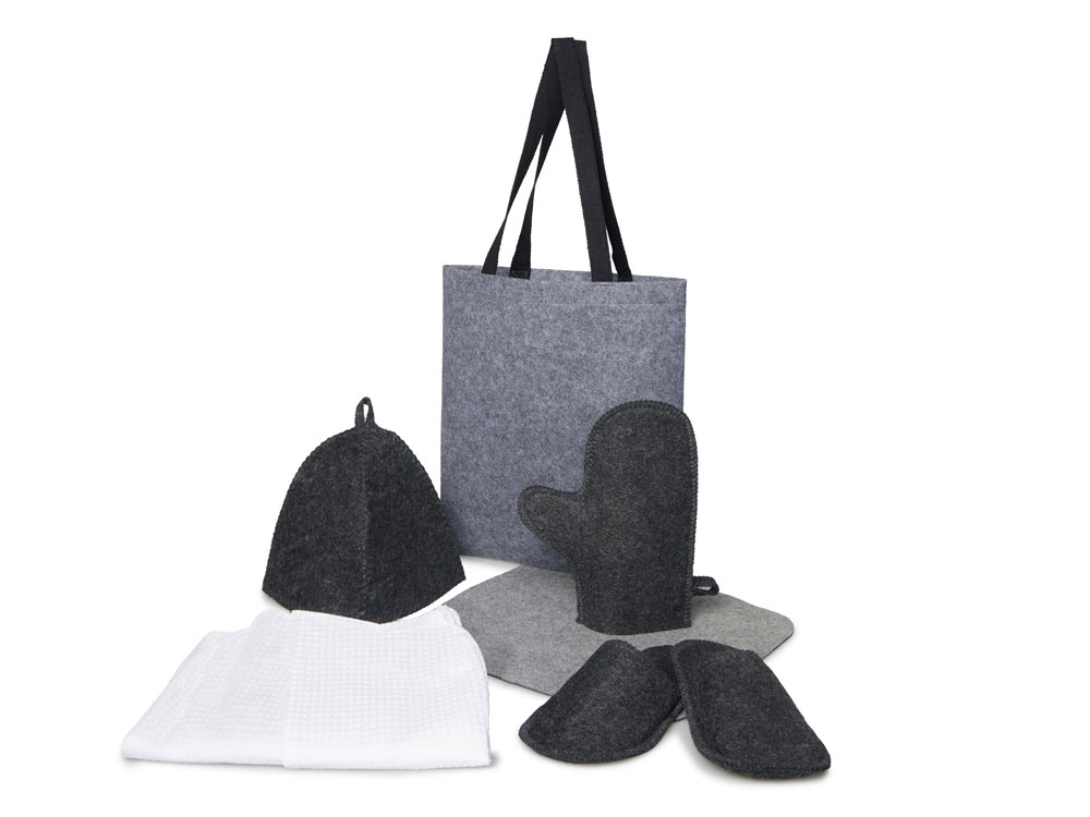 шопер- 100% RPET полиэстер, коврик- 80% полиэфир, 20% шерсть, шапка, тапочки, рукавица- войлок, килт- 100% хлопок |