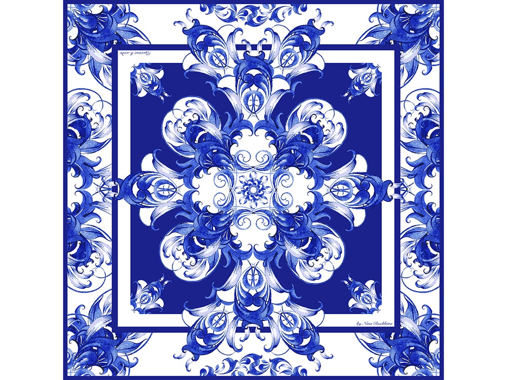 Платок Гжель от бренда Русские в моде выполнен в технике знаменитой кобальтовой росписи. Узоры в тонких оттенках синего цвета, размещенные на белом фоне, — один из самых распространенных рисунков гжель, чья форма столетиями доводилась мастерами до совершенства. На полотне восхитительные соцветия тугих бутонов и ажурных лепестков гармонично соседствуют с узнаваемыми сине-голубыми завитками, спиралями и линиями.