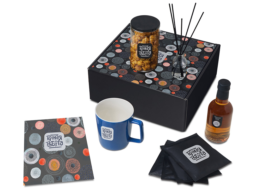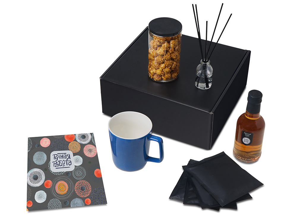 диффузор - стекло, кофе в дрип пакете - пластик, кружка - костяной фарфор, попкорн - пластик, металл, мешок - нетканый материал (спанбонд), коробка - картон |