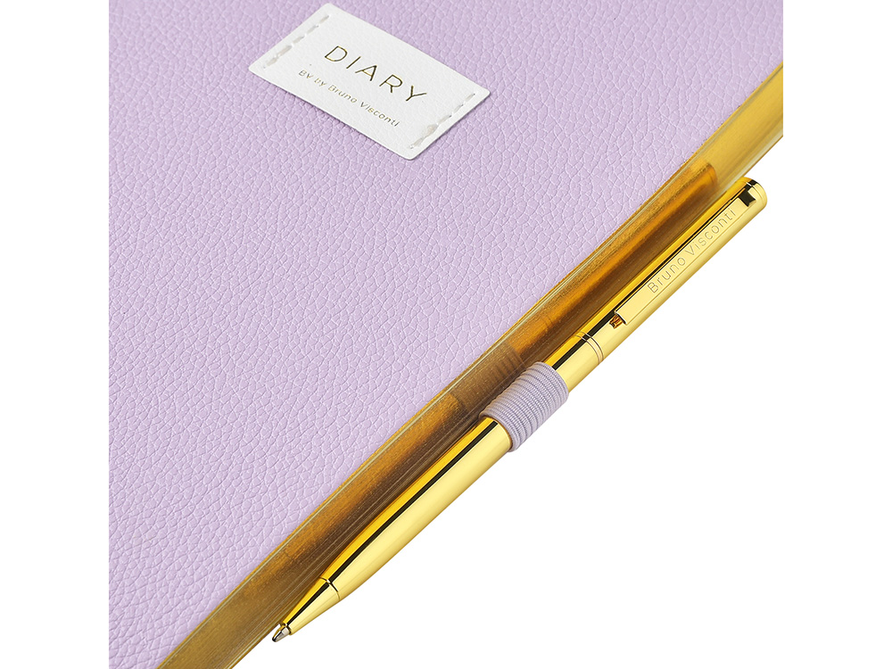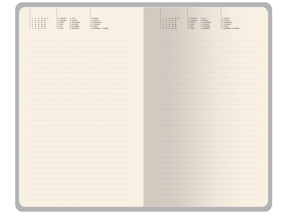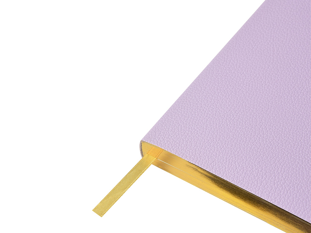 Внутри — недатированный блок формата А5 (125×200 мм) на бежевой бумаге 80 г/м². Книжный переплёт хорошо раскрывается, а скруглённые углы одновременно придают ежедневнику премиальный вид и защищают края при носке. Завершают детали ляссе в цвет обложки и петля для ручки — чтобы всё нужное было под рукой.