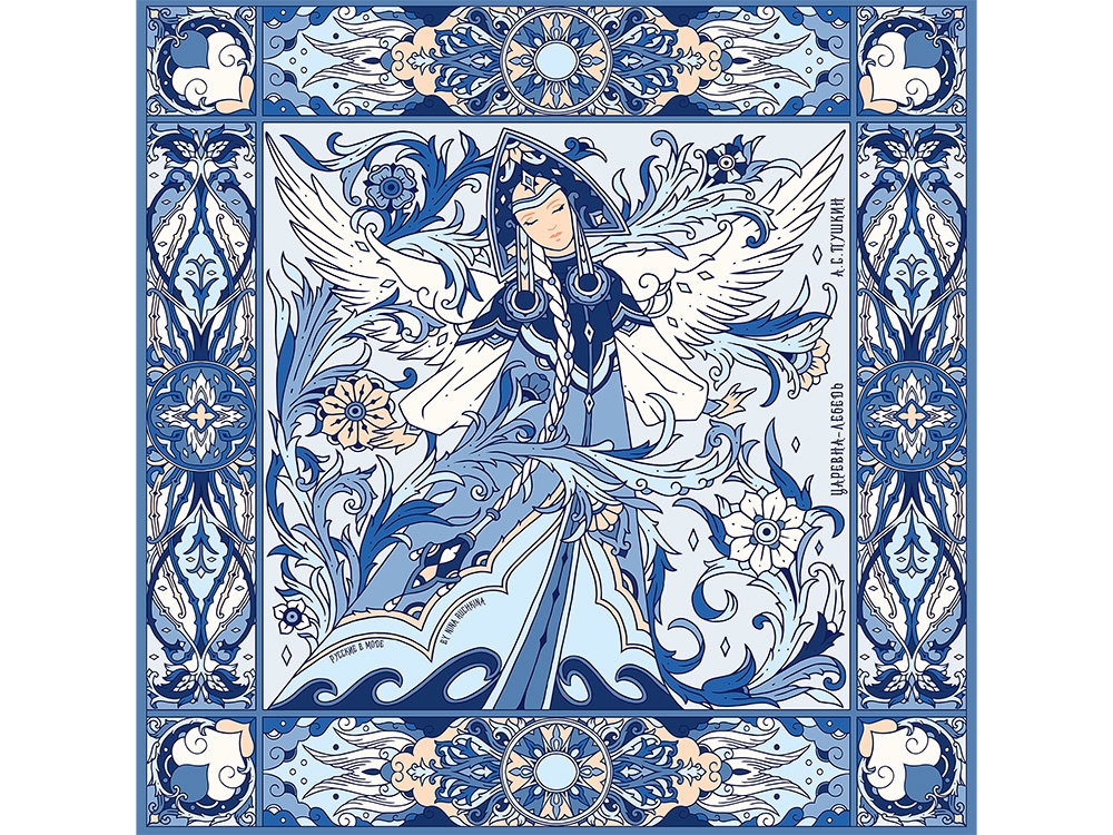 В центре авторского принта — удивительной красоты женщина с белоснежными крыльями, наделенная магическими способностями и житейской мудростью. Оригинальное сочетание тонов, цветочных орнаментов и русского колорита делают аксессуар нежным и самобытным.