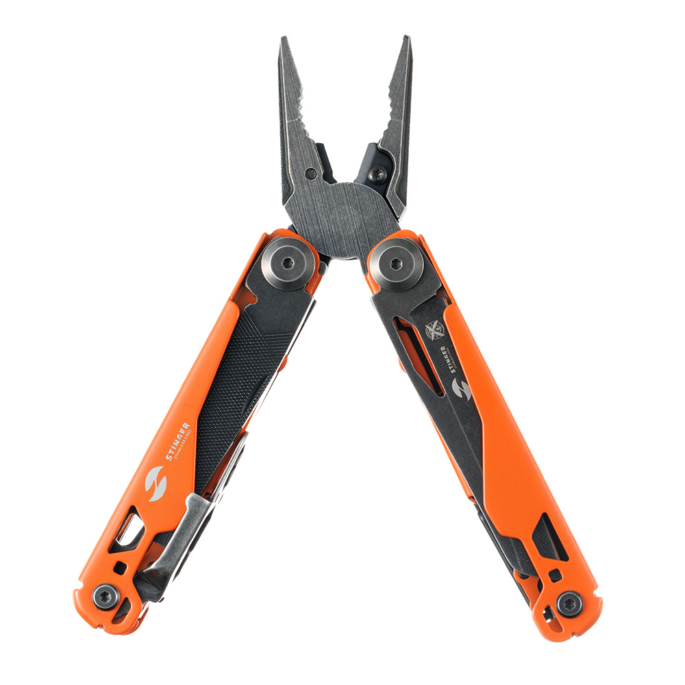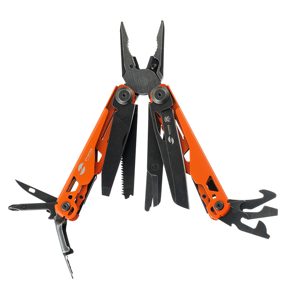 Мультитул Stinger, 107 х 19 мм, 19 функций, сталь, оранжевый корпус, стоунвош, в картонной коробке, в комплекте нейлоновый чехол, MT-GHK11-ORN