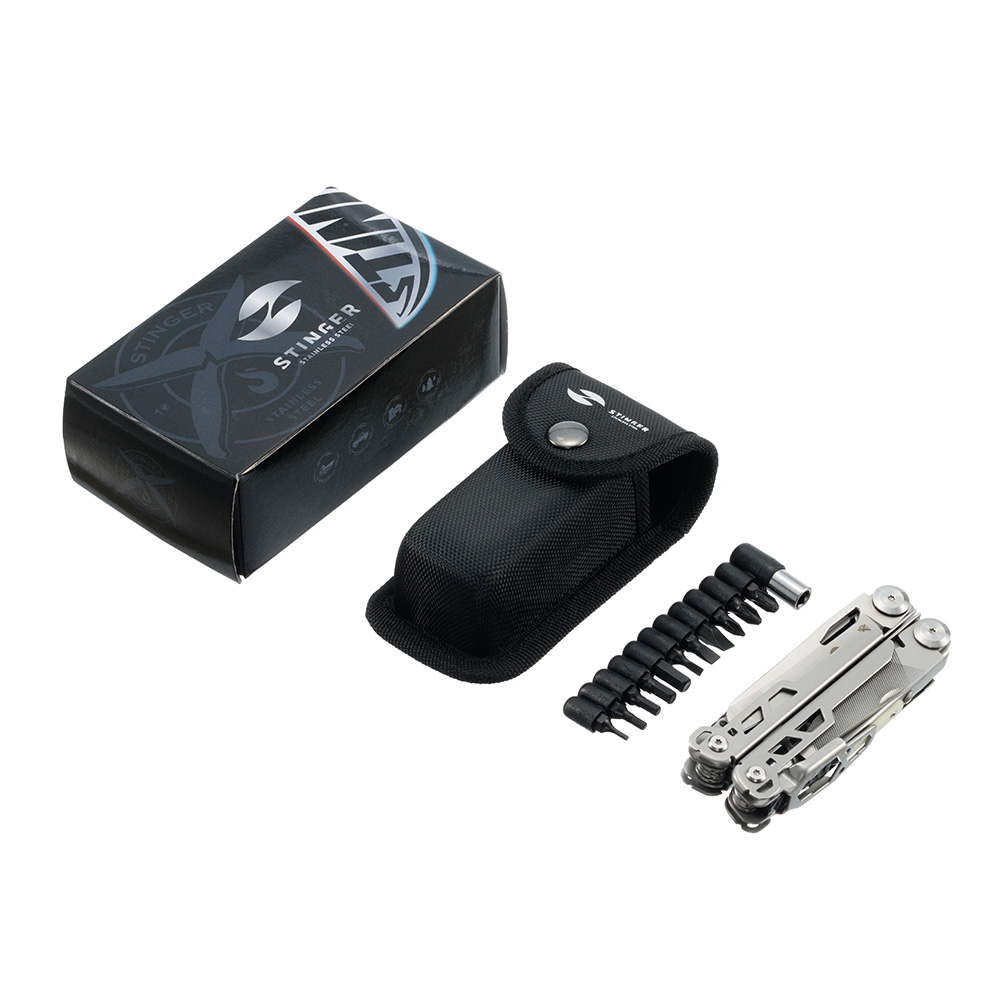 Мультитул Stinger, 110 х 22 мм, 22 функции, сталь, серебристый, в картонной коробке, в комплекте нейлоновый чехол, MT-GHK20-1A