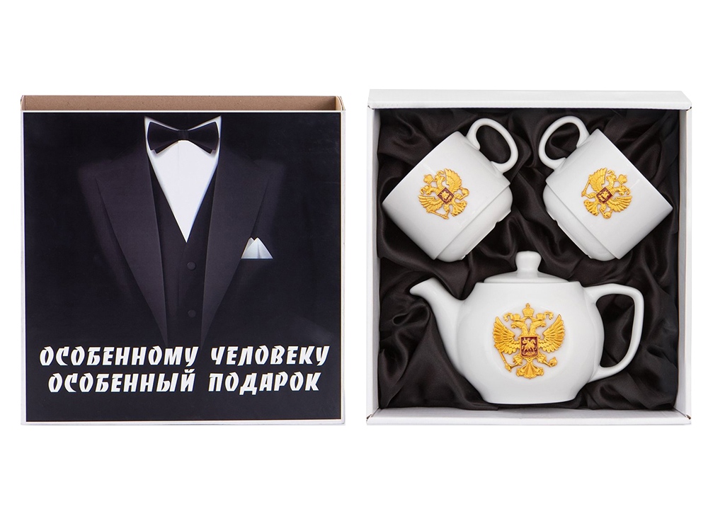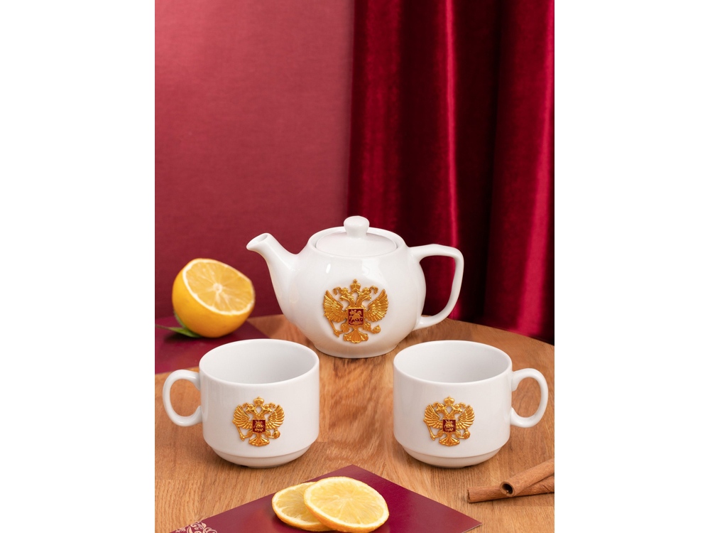Фарфоровый чайник и две фарфоровые чайные кружки с чеканным металлическим декором Двуглавый орел. Накладка изготовлена из алюминия методом чеканки с декоративной отделкой под золото.
