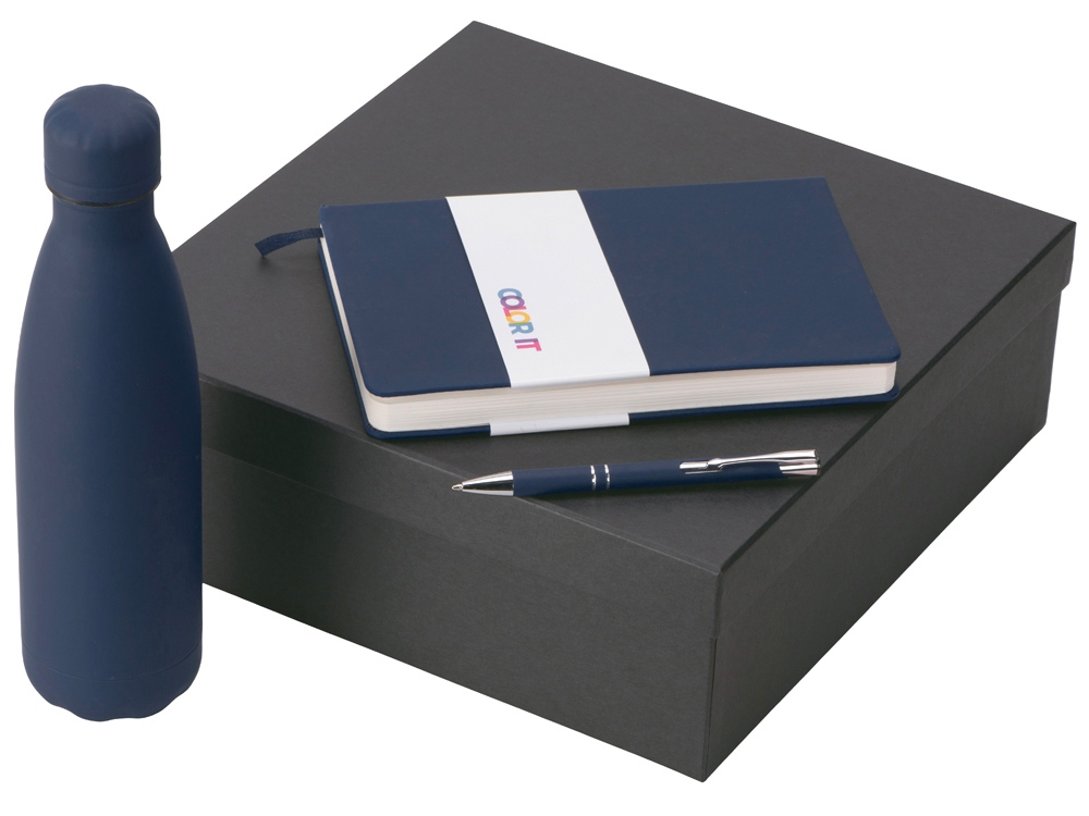 Подарочный набор с блокнотом С3, металлической ручкой и термобутылкой, темно-синий , размер магнитная обложка, 350088.04