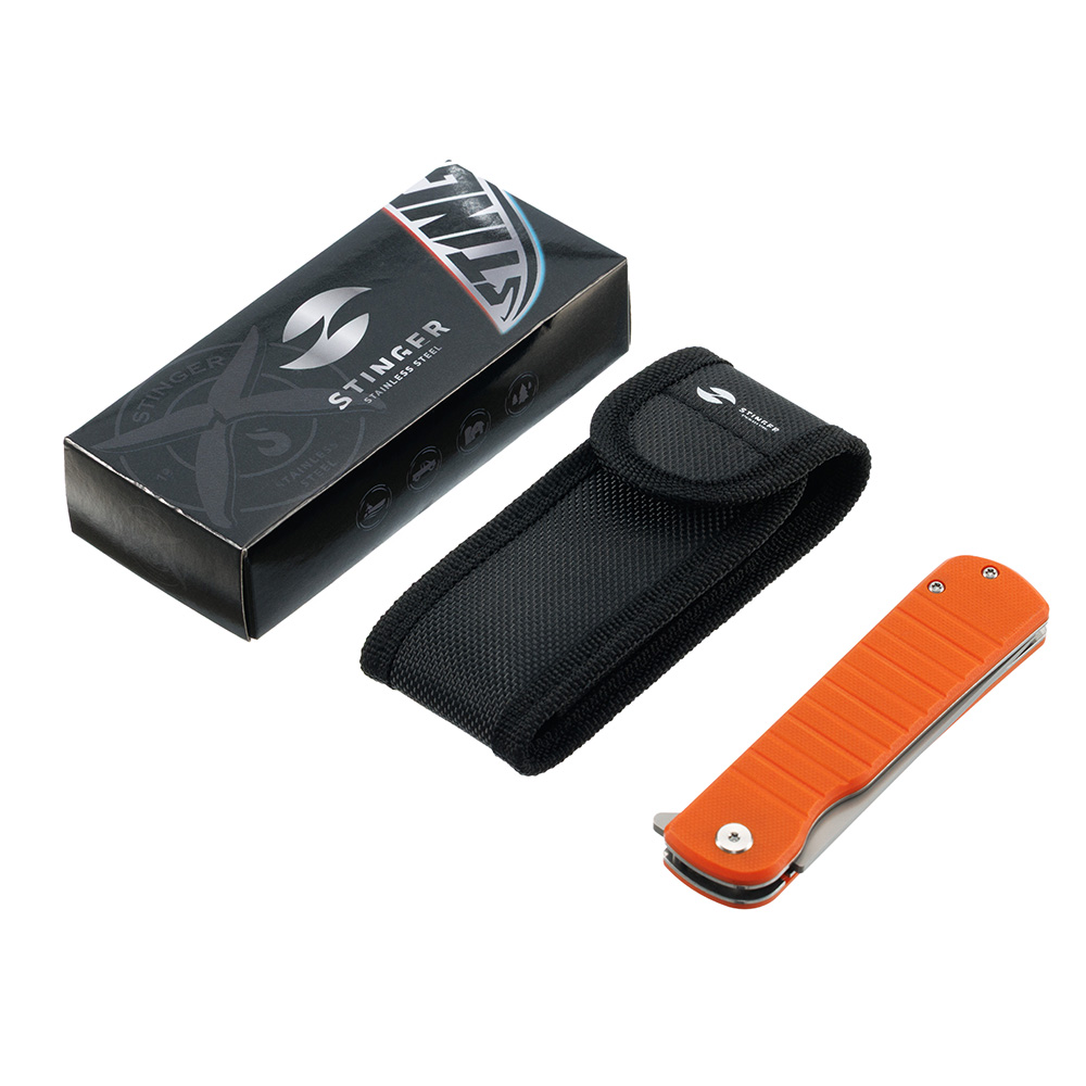 Нож складной Stinger, 107 мм (серебристый), сталь D2, материал рукояти: стеклотекстолит G10 (оранжевый), в картонной коробке, FK-KL277-ORN