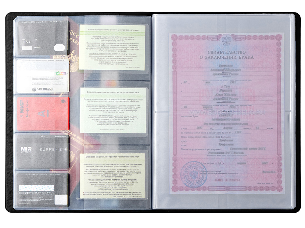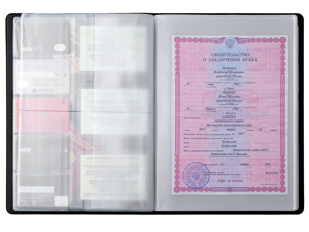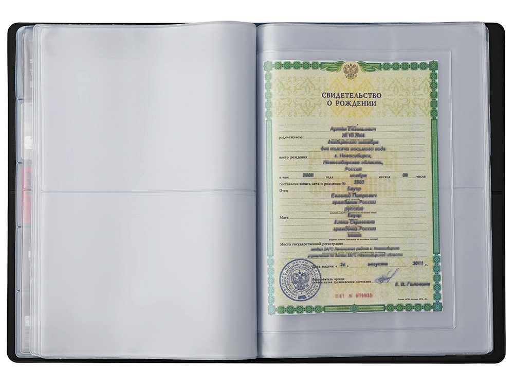 С ним свидетельства о рождении, браке и др. важные документы будут рассортированы и доступны для просмотра, будучи помещенными в прозрачные кармашки из пленки ПВХ.